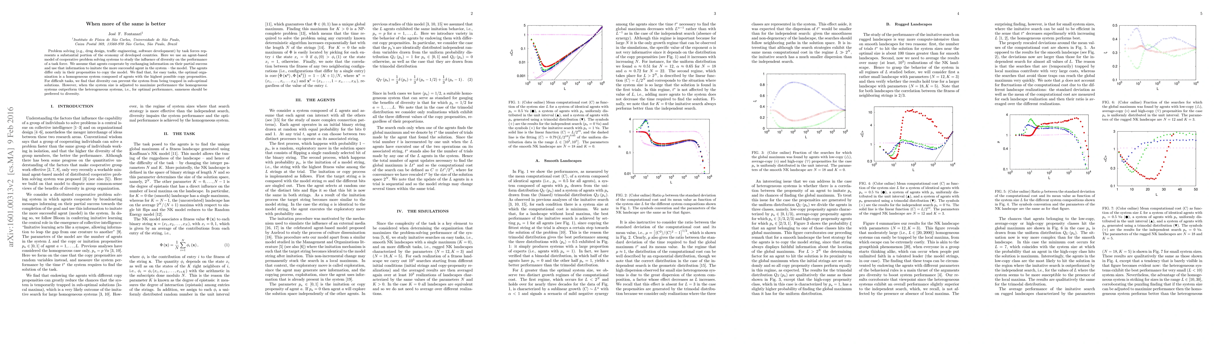 Problem solving (e.g., drug design, traffic engineering, software development) by task forces represents a substantial portion of the economy of developed countries. Here we use an agent-based model of cooperative problem solving systems to study the influence of diversity on the performance of a task force. We assume that agents cooperate by exchanging information on their partial success and use that information to imitate the more successful agent in the system -- the model. The agents differ only in their propensities to copy the model. We find that, for easy tasks, the optimal organization is a homogeneous system composed of agents with the highest possible copy propensities. For difficult tasks, we find that diversity can prevent the system from being trapped in sub-optimal solutions. However, when the system size is adjusted to maximize performance the homogeneous systems outperform the heterogeneous systems, i.e., for optimal performance, sameness should be preferred to diversity.