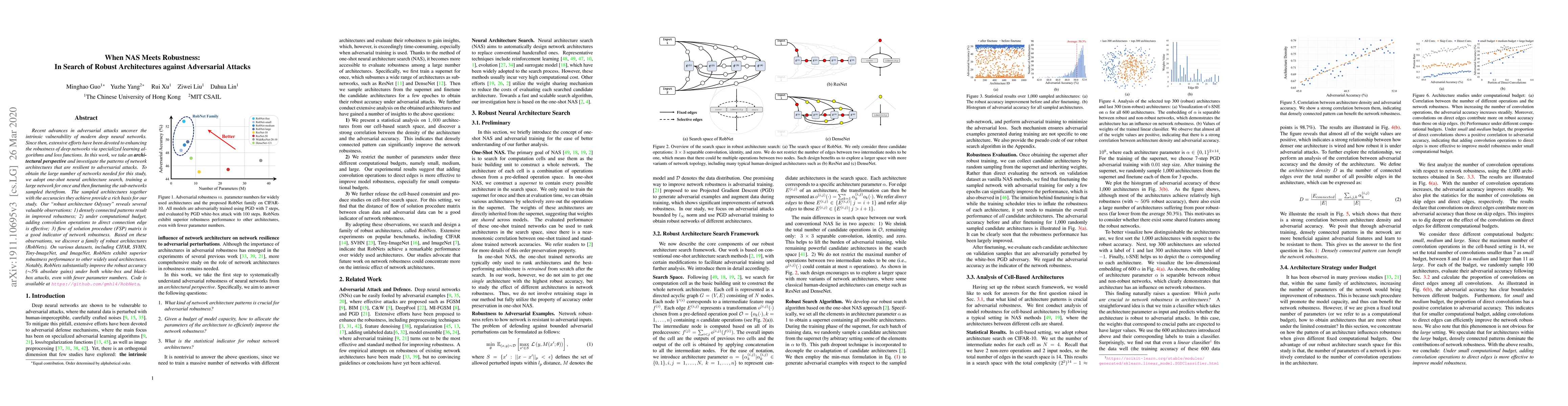 This paper explores network architectures that are resilient to adversarial attacks using one-shot neural architecture search. It finds that densely connected patterns and convolution operations enhance robustness, leading to the development of RobNets, which outperform other architectures in robust accuracy across various datasets.