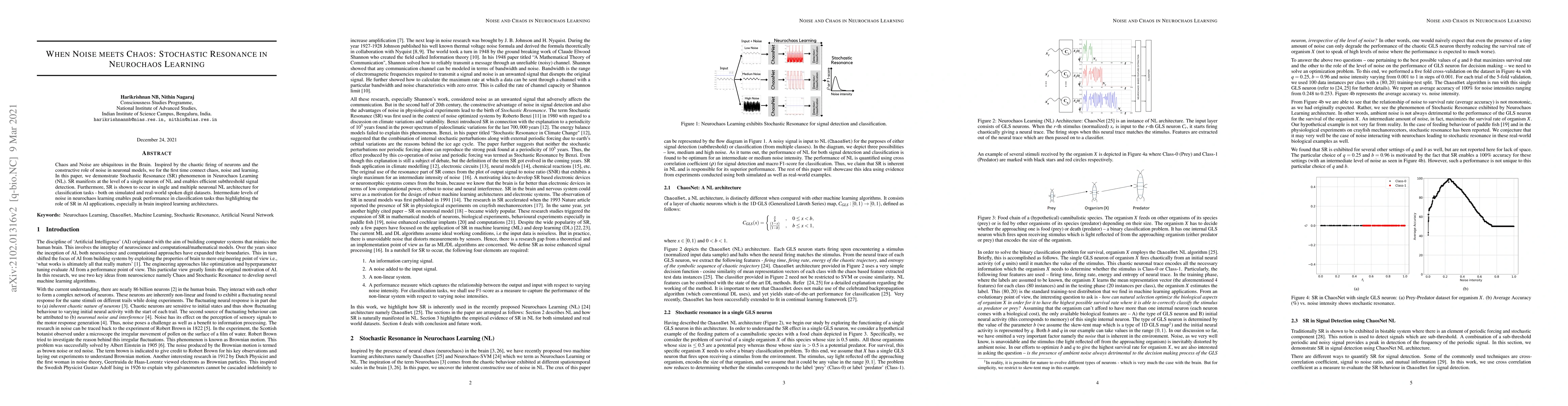 Chaos and Noise are ubiquitous in the Brain. Inspired by the chaotic firing of neurons and the constructive role of noise in neuronal models, we for the first time connect chaos, noise and learning. In this paper, we demonstrate Stochastic Resonance (SR) phenomenon in Neurochaos Learning (NL). SR manifests at the level of a single neuron of NL and enables efficient subthreshold signal detection. Furthermore, SR is shown to occur in single and multiple neuronal NL architecture for classification tasks - both on simulated and real-world spoken digit datasets. Intermediate levels of noise in neurochaos learning enables peak performance in classification tasks thus highlighting the role of SR in AI applications, especially in brain inspired learning architectures.