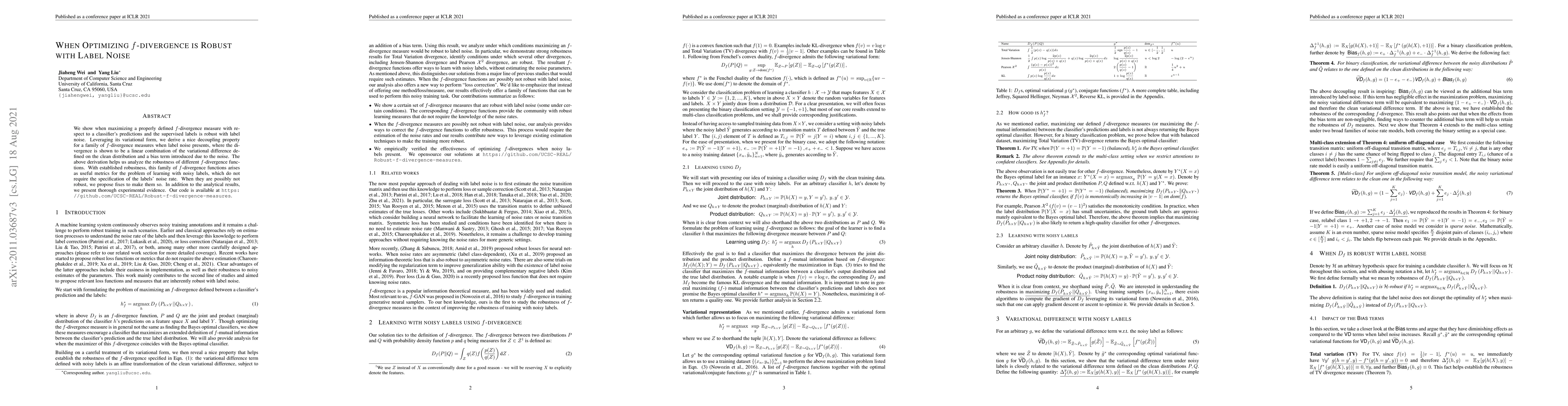 We show when maximizing a properly defined $f$-divergence measure with respect to a classifier's predictions and the supervised labels is robust with label noise. Leveraging its variational form, we derive a nice decoupling property for a family of $f$-divergence measures when label noise presents, where the divergence is shown to be a linear combination of the variational difference defined on the clean distribution and a bias term introduced due to the noise. The above derivation helps us analyze the robustness of different $f$-divergence functions. With established robustness, this family of $f$-divergence functions arises as useful metrics for the problem of learning with noisy labels, which do not require the specification of the labels' noise rate. When they are possibly not robust, we propose fixes to make them so. In addition to the analytical results, we present thorough experimental evidence. Our code is available at https://github.com/UCSC-REAL/Robust-f-divergence-measures.