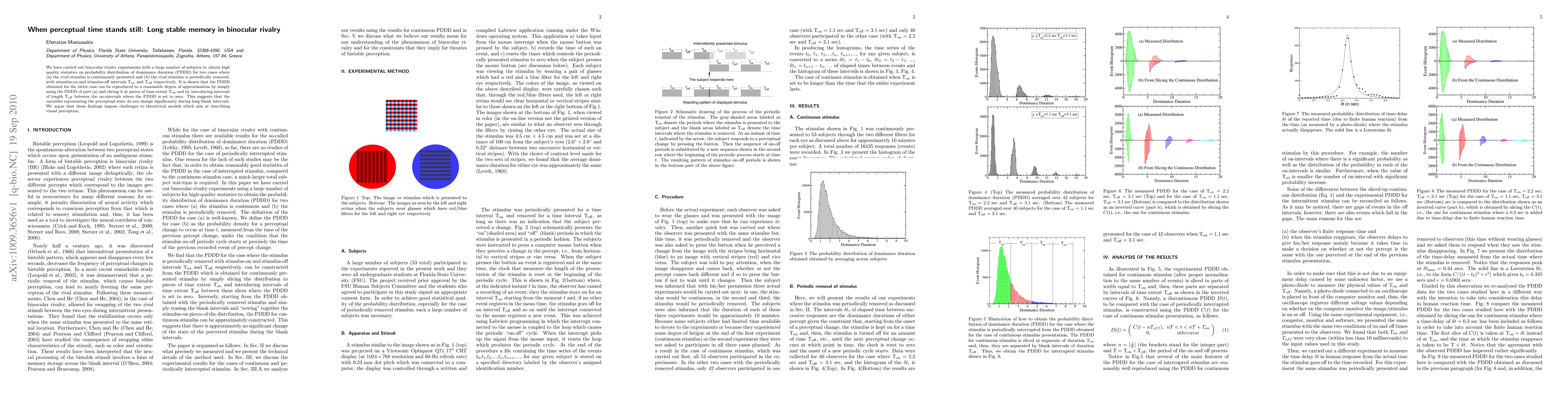 This study explores binocular rivalry and finds that perceptual stability during blank intervals suggests long-term memory retention of perceptual states, challenging existing theoretical models of visual perception. The results indicate that perceptual states remain largely unchanged during extended periods of stimulus absence.