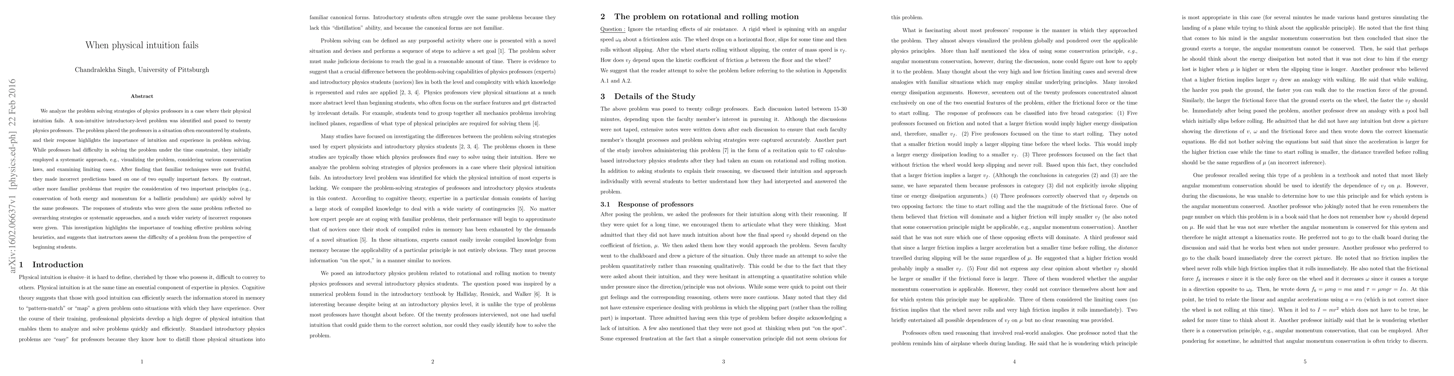 We analyze the problem solving strategies of physics professors in a case where their physical intuition fails. A non-intuitive introductory-level problem was identified and posed to twenty physics professors. The problem placed the professors in a situation often encountered by students, and their response highlights the importance of intuition and experience in problem solving. While professors had difficulty in solving the problem under the time constraint, they initially employed a systematic approach, e.g., visualizing the problem, considering various conservation laws, and examining limiting cases. After finding that familiar techniques were not fruitful, they made incorrect predictions based on one of two equally important factors. By contrast, other more familiar problems that require the consideration of two important principles (e.g., conservation of both energy and momentum for a ballistic pendulum) are quickly solved by the same professors. The responses of students who were given the same problem reflected no overarching strategies or systematic approaches, and a much wider variety of incorrect responses were given. This investigation highlights the importance of teaching effective problem solving heuristics, and suggests that instructors assess the difficulty of a problem from the perspective of beginning students.
