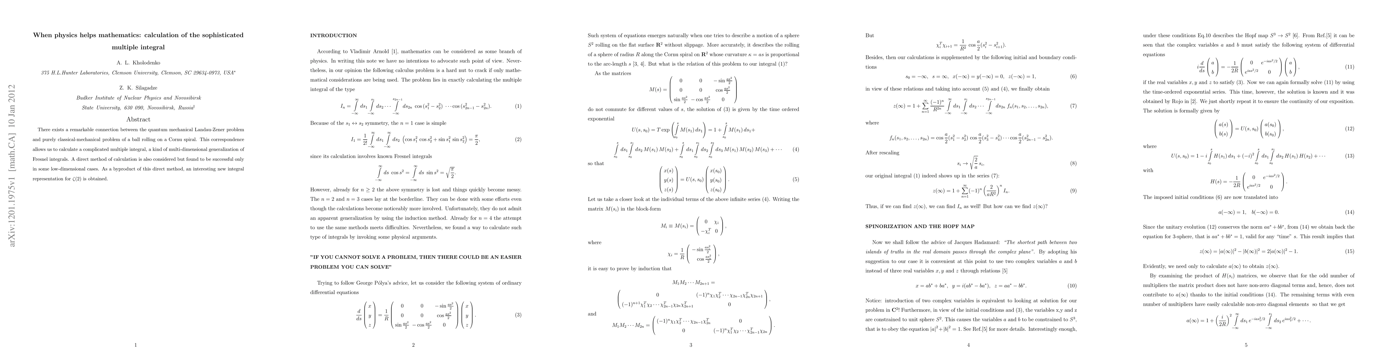 There exists a remarkable connection between the quantum mechanical Landau-Zener problem and purely classical-mechanical problem of a ball rolling on a Cornu spiral. This correspondence allows us to calculate a complicated multiple integral, a kind of multi-dimensional generalization of Fresnel integrals. A direct method of calculation is also considered but found to be successful only in some low-dimensional cases. As a byproduct of this direct method, an interesting new integral representation for $\zeta(2)$ is obtained.