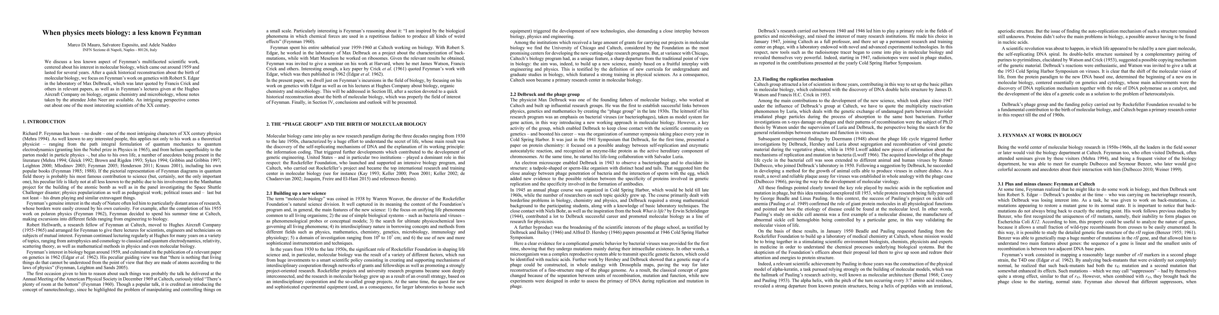 This paper explores Richard Feynman's lesser-known contributions to molecular biology in the late 1950s, highlighting his collaborative work on genetics with Robert S. Edgar and its influence on later scientific developments and lectures. It provides insight into Feynman's interdisciplinary interests and his impact on biology and chemistry.