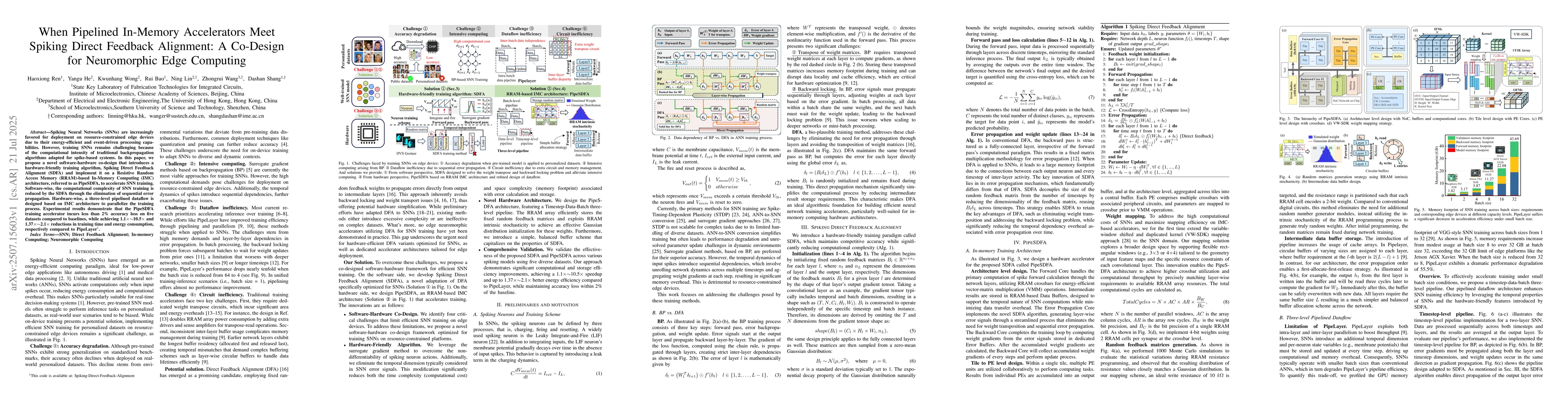 Spiking Neural Networks (SNNs) are increasingly favored for deployment on resource-constrained edge devices due to their energy-efficient and event-driven processing capabilities. However, training SNNs remains challenging because of the computational intensity of traditional backpropagation algorithms adapted for spike-based systems. In this paper, we propose a novel software-hardware co-design that introduces a hardware-friendly training algorithm, Spiking Direct Feedback Alignment (SDFA) and implement it on a Resistive Random Access Memory (RRAM)-based In-Memory Computing (IMC) architecture, referred to as PipeSDFA, to accelerate SNN training. Software-wise, the computational complexity of SNN training is reduced by the SDFA through the elimination of sequential error propagation. Hardware-wise, a three-level pipelined dataflow is designed based on IMC architecture to parallelize the training process. Experimental results demonstrate that the PipeSDFA training accelerator incurs less than 2% accuracy loss on five datasets compared to baselines, while achieving 1.1X~10.5X and 1.37X~2.1X reductions in training time and energy consumption, respectively compared to PipeLayer.
