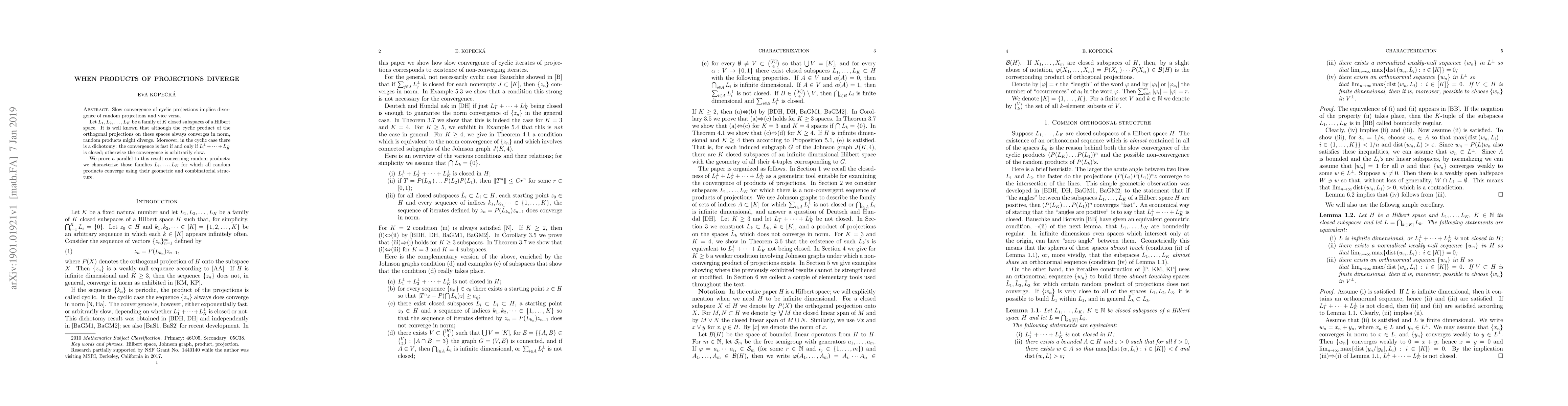 Slow convergence of cyclic projections implies divergence of random projections and vice versa. Let $L_1,L_2,\dots,L_K$ be a family of $K$ closed subspaces of a Hilbert space. It is well known that although the cyclic product of the orthogonal projections on these spaces always converges in norm, random products might diverge. Moreover, in the cyclic case there is a dichotomy: the convergence is fast if and only if $L_1^{\perp}+\dots+L_K^{\perp}$ is closed; otherwise the convergence is arbitrarily slow. We prove a parallel to this result concerning random products: we characterize those families $L_1,\dots,L_K$ for which all random products converge using their geometric and combinatorial structure.