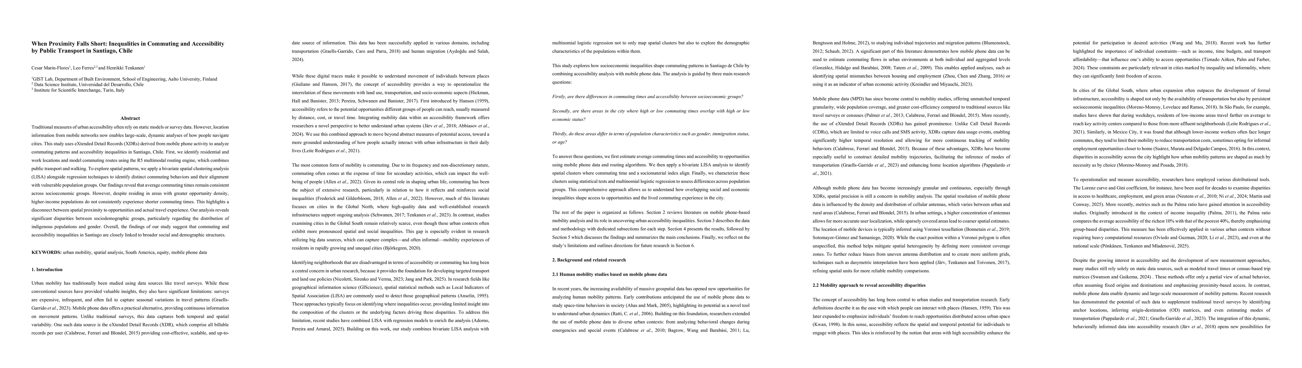 This study uses eXtended Detail Records (XDRs) derived from mobile phone activity to analyze commuting patterns and accessibility inequalities in Santiago, Chile. It identifies residential and work locations, models commuting routes using the R5 multimodal routing engine, and applies bivariate spatial clustering analysis (LISA) alongside regression techniques.