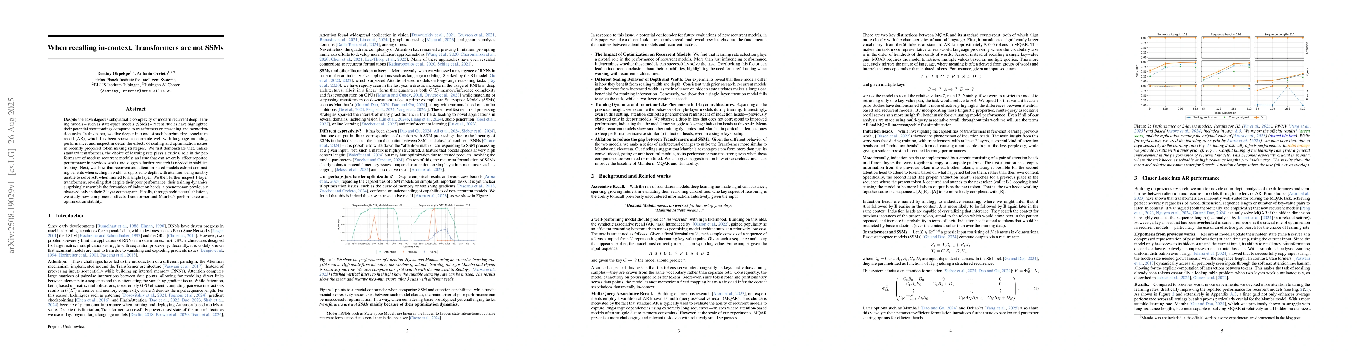 Despite the advantageous subquadratic complexity of modern recurrent deep learning models -- such as state-space models (SSMs) -- recent studies have highlighted their potential shortcomings compared to transformers on reasoning and memorization tasks. In this paper, we dive deeper into one of such benchmarks: associative recall (AR), which has been shown to correlate well with language modeling performance, and inspect in detail the effects of scaling and optimization issues in recently proposed token mixing strategies. We first demonstrate that, unlike standard transformers, the choice of learning rate plays a critical role in the performance of modern recurrent models: an issue that can severely affect reported performance in previous works and suggests further research is needed to stabilize training. Next, we show that recurrent and attention-based models exhibit contrasting benefits when scaling in width as opposed to depth, with attention being notably unable to solve AR when limited to a single layer. We then further inspect 1-layer transformers, revealing that despite their poor performance, their training dynamics surprisingly resemble the formation of induction heads, a phenomenon previously observed only in their 2-layer counterparts. Finally, through architectural ablations, we study how components affects Transformer and Mamba's performance and optimization stability.