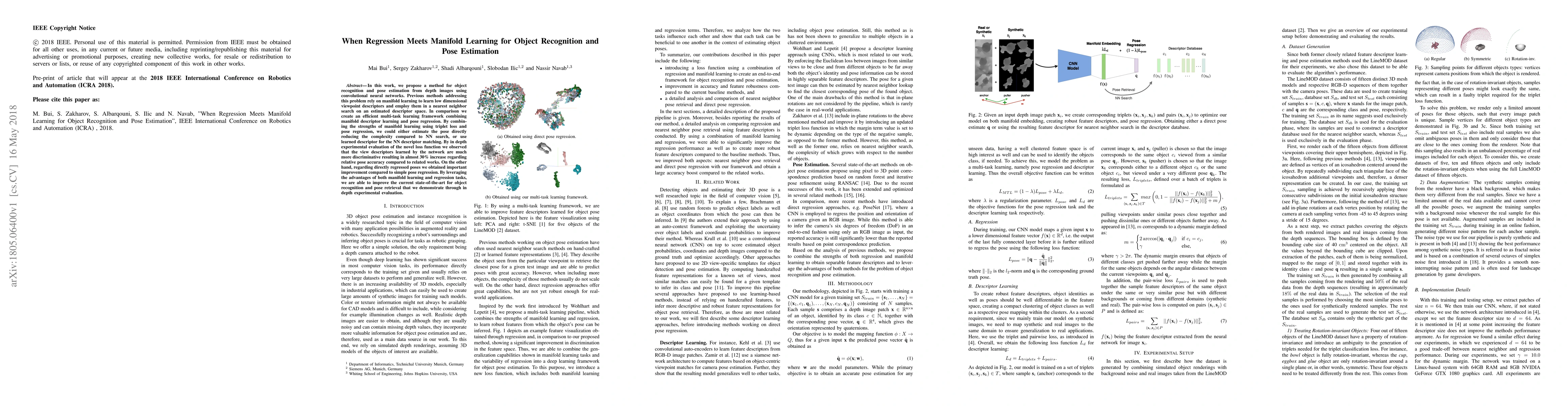 This paper proposes a multi-task learning framework that combines manifold learning and pose regression for object recognition and pose estimation from depth images. The method achieves a 30% improvement in relative pose accuracy compared to previous methods by leveraging discriminative view descriptors and direct pose regression.