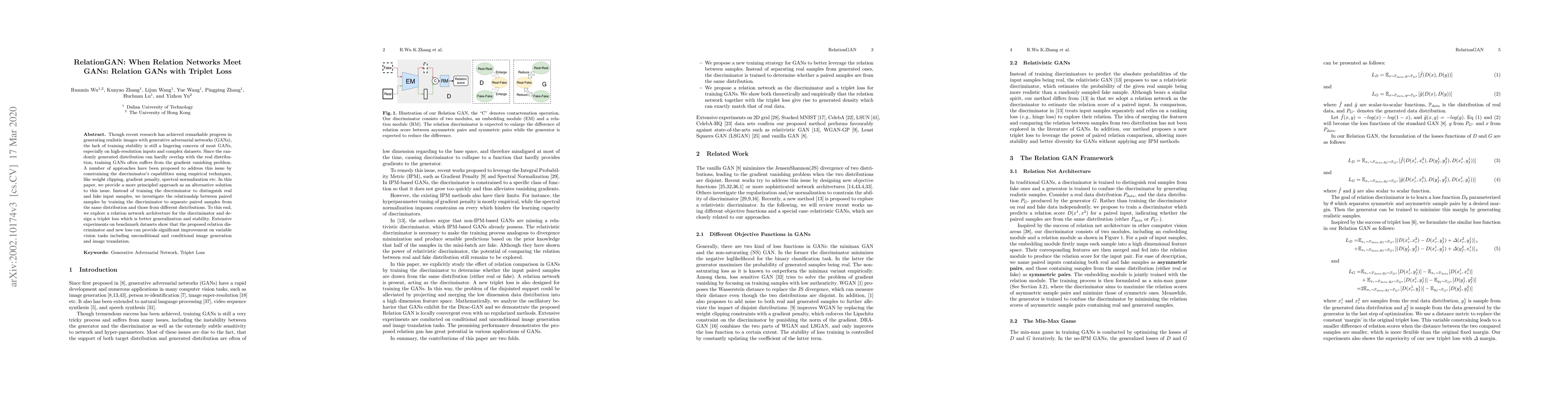 This paper proposes a Relation GAN with a triplet loss to improve training stability for GANs, especially for high-resolution inputs. It uses a relation network discriminator trained with a triplet loss to better capture relationships between paired samples, achieving better generalization and stability in image generation and translation tasks.