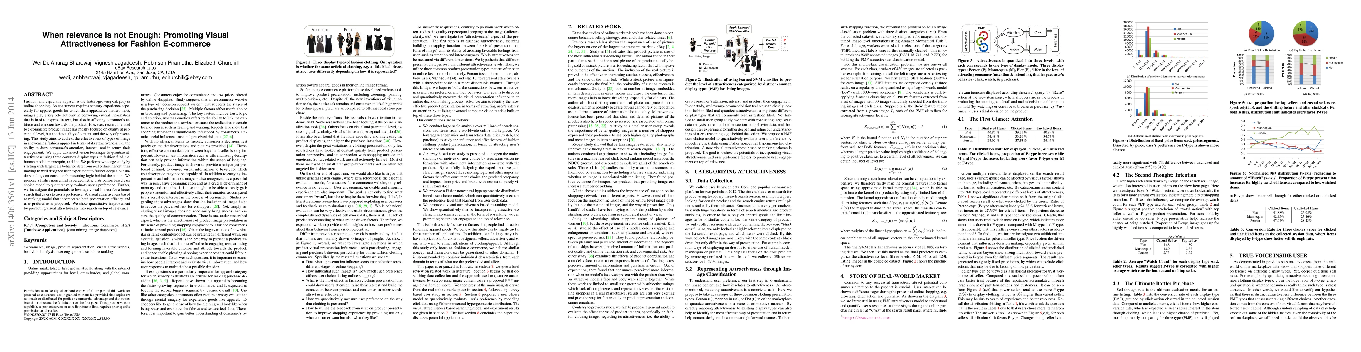 Fashion, and especially apparel, is the fastest-growing category in online shopping. As consumers requires sensory experience especially for apparel goods for which their appearance matters most, images play a key role not only in conveying crucial information that is hard to express in text, but also in affecting consumer's attitude and emotion towards the product. However, research related to e-commerce product image has mostly focused on quality at perceptual level, but not the quality of content, and the way of presenting. This study aims to address the effectiveness of types of image in showcasing fashion apparel in terms of its attractiveness, i.e. the ability to draw consumer's attention, interest, and in return their engagement. We apply advanced vision technique to quantize attractiveness using three common display types in fashion filed, i.e. human model, mannequin, and flat. We perform two-stage study by starting with large scale behavior data from real online market, then moving to well designed user experiment to further deepen our understandings on consumer's reasoning logic behind the action. We propose a Fisher noncentral hypergeometric distribution based user choice model to quantitatively evaluate user's preference. Further, we investigate the potentials to leverage visual impact for a better search that caters to user's preference. A visual attractiveness based re-ranking model that incorporates both presentation efficacy and user preference is proposed. We show quantitative improvement by promoting visual attractiveness into search on top of relevance.