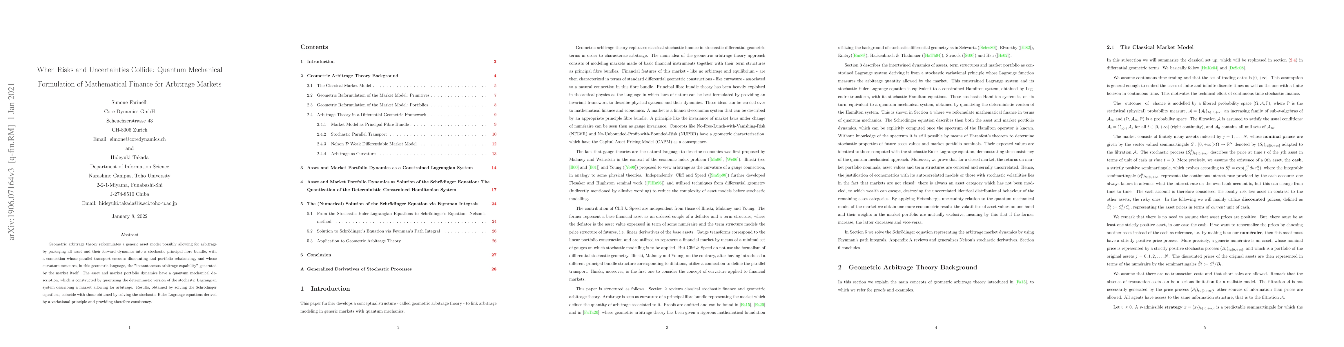 Geometric arbitrage theory reformulates a generic asset model possibly allowing for arbitrage by packaging all asset and their forward dynamics into a stochastic principal fibre bundle, with a connection whose parallel transport encodes discounting and portfolio rebalancing, and whose curvature measures, in this geometric language, the instantaneous arbitrage capability generated by the market itself. The asset and market portfolio dynamics have a quantum mechanical description, which is constructed by quantizing the deterministic version of the stochastic Lagrangian system describing a market allowing for arbitrage. Results, obtained by solving the Schroedinger equation, coincide with those obtained by solving the stochastic Euler Lagrange equations derived by a variational principle and providing therefore consistency.