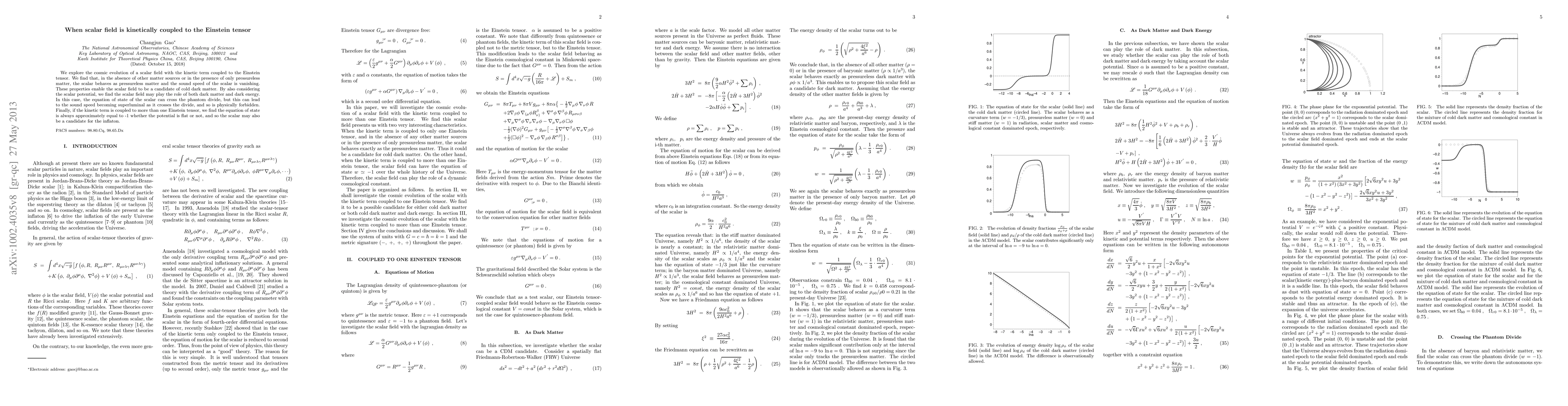 This paper investigates a scalar field kinetically coupled to the Einstein tensor, finding it behaves as cold dark matter in specific conditions. The scalar field can also act as dark energy, potentially crossing the phantom divide, though this leads to superluminal sound speed, which is unphysical. Coupling to multiple Einstein tensors results in an equation of state close to -1, suggesting the scalar could serve as an inflaton.