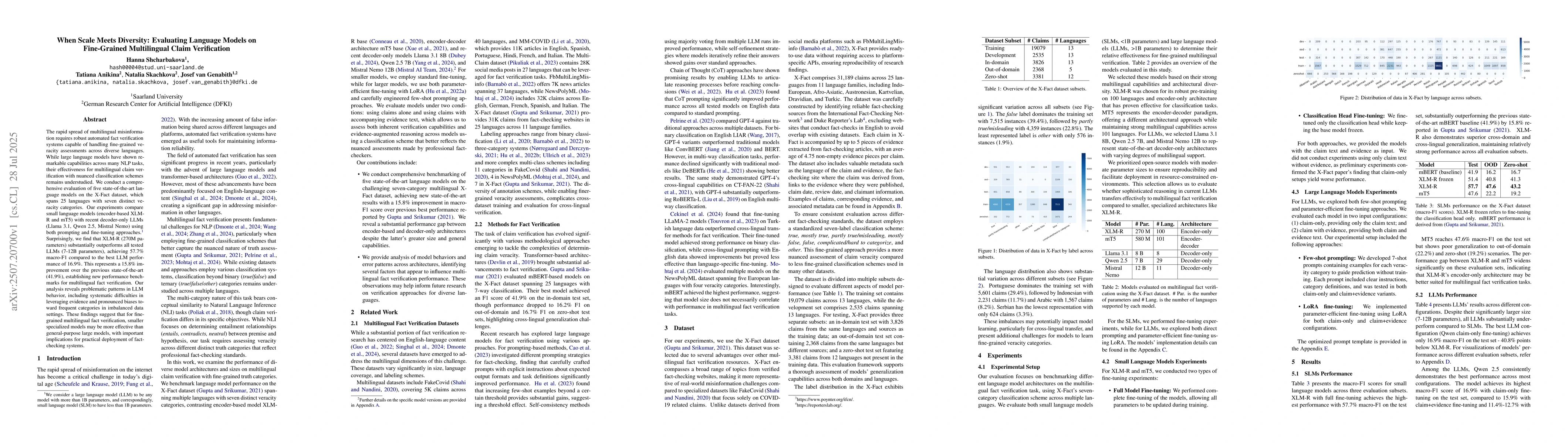 The rapid spread of multilingual misinformation requires robust automated fact verification systems capable of handling fine-grained veracity assessments across diverse languages. While large language models have shown remarkable capabilities across many NLP tasks, their effectiveness for multilingual claim verification with nuanced classification schemes remains understudied. We conduct a comprehensive evaluation of five state-of-the-art language models on the X-Fact dataset, which spans 25 languages with seven distinct veracity categories. Our experiments compare small language models (encoder-based XLM-R and mT5) with recent decoder-only LLMs (Llama 3.1, Qwen 2.5, Mistral Nemo) using both prompting and fine-tuning approaches. Surprisingly, we find that XLM-R (270M parameters) substantially outperforms all tested LLMs (7-12B parameters), achieving 57.7% macro-F1 compared to the best LLM performance of 16.9%. This represents a 15.8% improvement over the previous state-of-the-art (41.9%), establishing new performance benchmarks for multilingual fact verification. Our analysis reveals problematic patterns in LLM behavior, including systematic difficulties in leveraging evidence and pronounced biases toward frequent categories in imbalanced data settings. These findings suggest that for fine-grained multilingual fact verification, smaller specialized models may be more effective than general-purpose large models, with important implications for practical deployment of fact-checking systems.