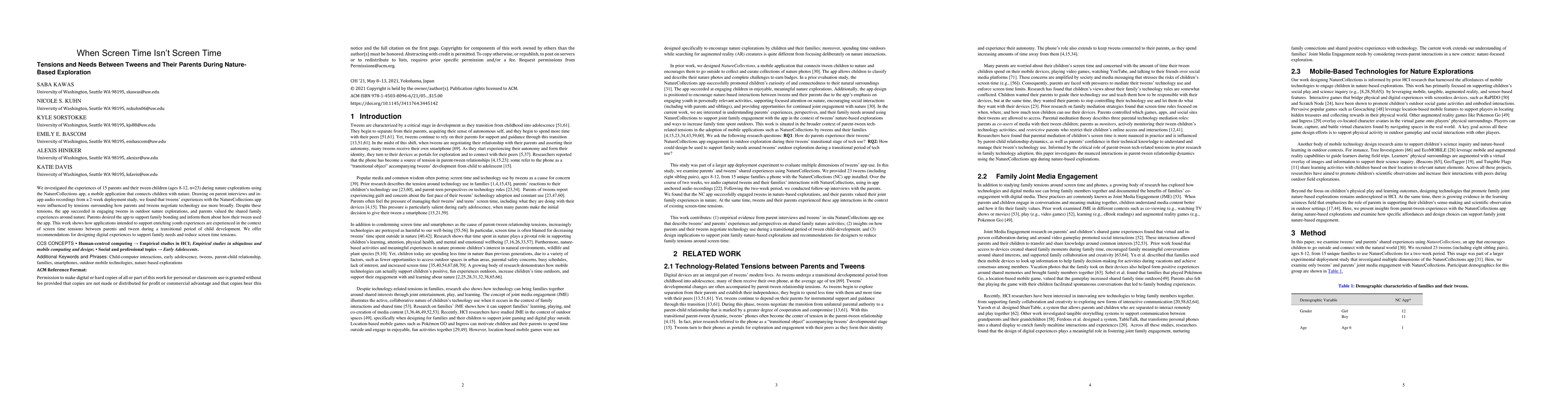 This study explores the dynamics between parents and tweens using a mobile app for nature exploration, revealing tensions over technology use while highlighting the app's success in fostering outdoor engagement and family bonding. Recommendations are provided for app design to better address family needs and ease screen time conflicts.