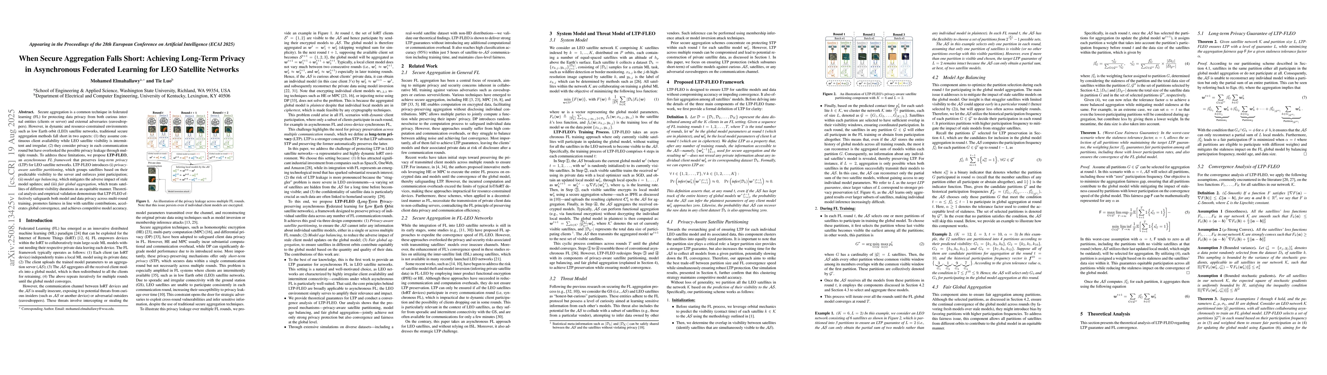 LTP-FLEO introduces privacy-aware satellite partitioning, model age balancing, and fair global aggregation, ensuring long-term privacy in asynchronous federated learning for LEO satellite networks.
