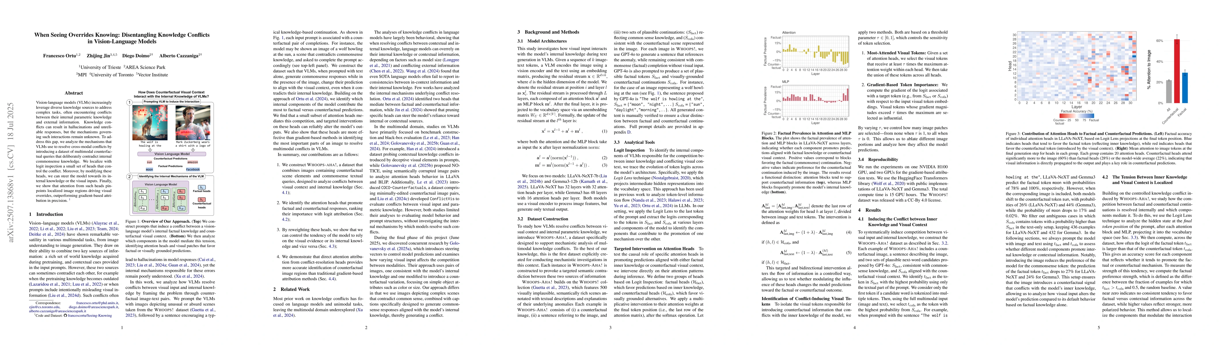 Vision-language models (VLMs) increasingly leverage diverse knowledge sources to address complex tasks, often encountering conflicts between their internal parametric knowledge and external information. Knowledge conflicts can result in hallucinations and unreliable responses, but the mechanisms governing such interactions remain unknown. To address this gap, we analyze the mechanisms that VLMs use to resolve cross-modal conflicts by introducing a dataset of multimodal counterfactual queries that deliberately contradict internal commonsense knowledge. We localize with logit inspection a small set of heads that control the conflict. Moreover, by modifying these heads, we can steer the model towards its internal knowledge or the visual inputs. Finally, we show that attention from such heads pinpoints localized image regions driving visual overrides, outperforming gradient-based attribution in precision.