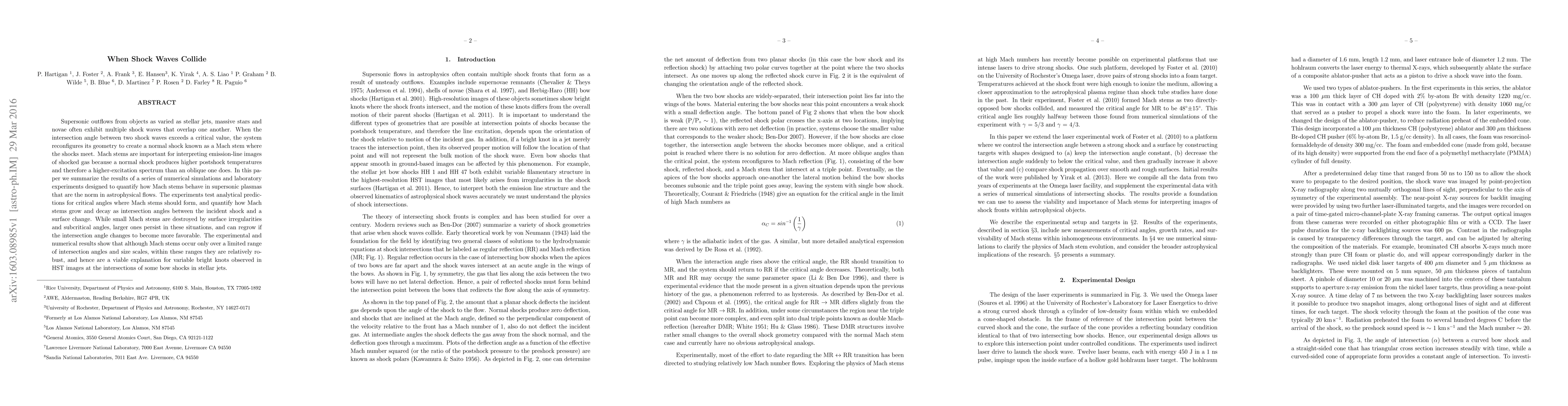 This research summarizes numerical simulations and experiments on Mach stems, formed when supersonic shock waves intersect in astrophysical flows. Mach stems, crucial for understanding high-excitation spectra, are found to be robust within certain size scales and intersection angles, explaining variable bright knots in stellar jet bow shock intersections observed by HST.