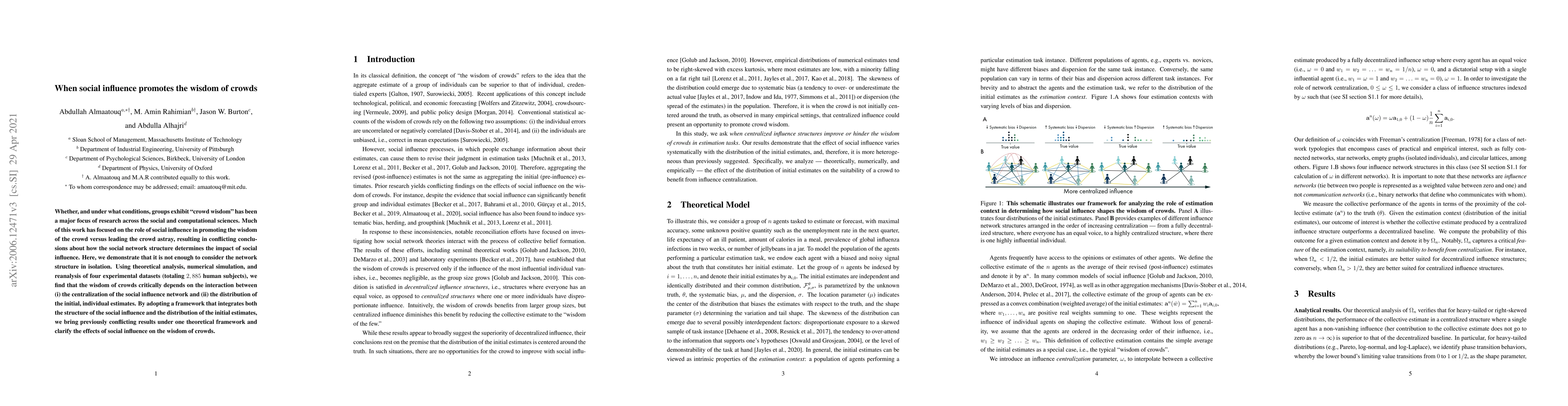 This paper investigates how social influence impacts the "wisdom of crowds," revealing that the centralization of social influence networks and the distribution of initial individual estimates jointly determine crowd accuracy. Integrating these factors clarifies the conditions under which social influence promotes crowd wisdom.