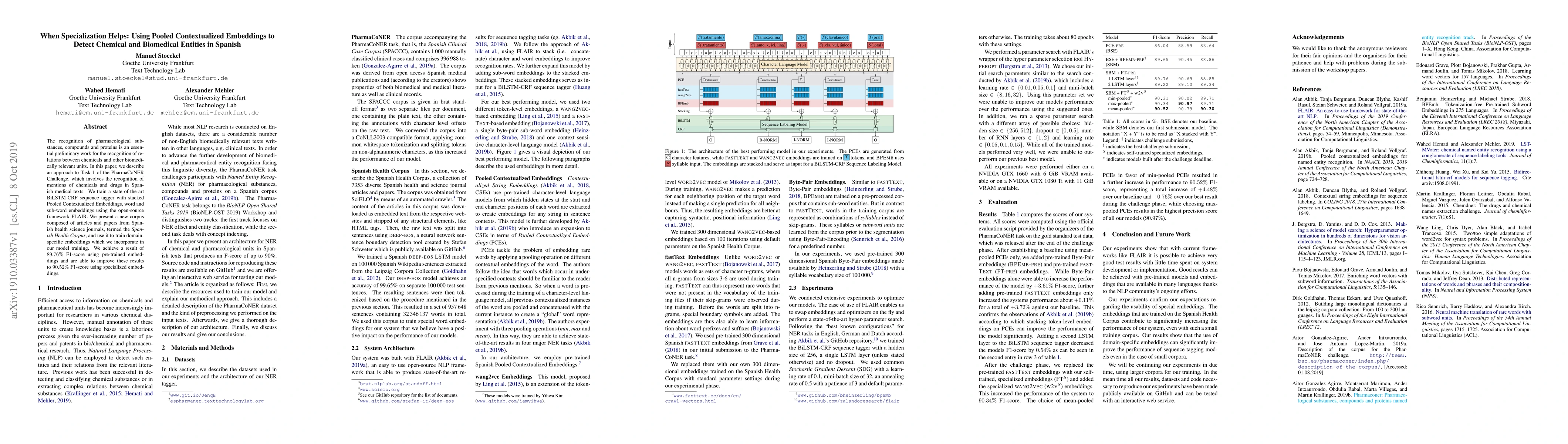 This paper presents a BiLSTM-CRF sequence tagger enhanced with Pooled Contextualized Embeddings for detecting chemical and biomedical entities in Spanish medical texts. The authors achieve an F1-score of 90.52% using a specialized Spanish Health Corpus, outperforming pre-trained embeddings.