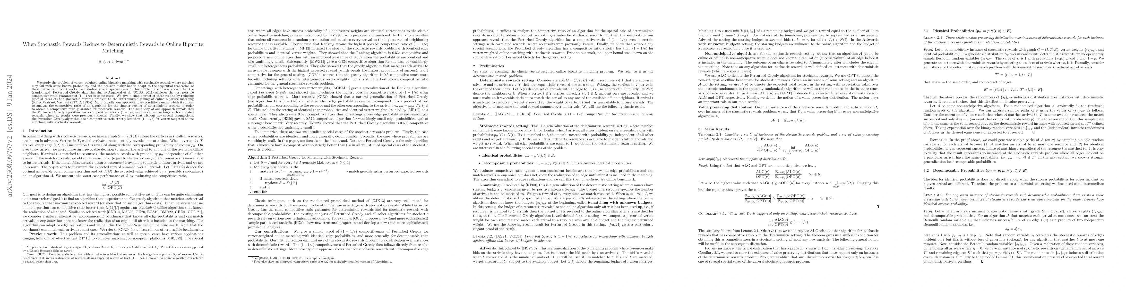 We study the problem of vertex-weighted online bipartite matching with stochastic rewards where matches may fail with some known probability and the decision maker has to adapt to the sequential realization of these outcomes. Recent works have studied several special cases of this problem and it was known that the (randomized) Perturbed Greedy algorithm due to Aggarwal et al. (SODA, 2011) achieves the best possible competitive ratio guarantee of $(1-1/e)$ in some cases. We give a simple proof of these results by reducing (special cases of) the stochastic rewards problem to the deterministic setting of online bipartite matching (Karp, Vazirani, Vazirani (STOC, 1990)). More broadly, our approach gives conditions under which it suffices to analyze the competitive ratio of an algorithm for the simpler setting of deterministic rewards in order to obtain a competitive ratio guarantee for stochastic rewards. The simplicity of our approach reveals that the Perturbed Greedy algorithm has a competitive ratio of $(1-1/e)$ even in certain settings with correlated rewards, where no results were previously known. Finally, we show that without any special assumptions, the Perturbed Greedy algorithm has a competitive ratio strictly less than $(1-1/e)$ for vertex-weighted online matching with stochastic rewards.