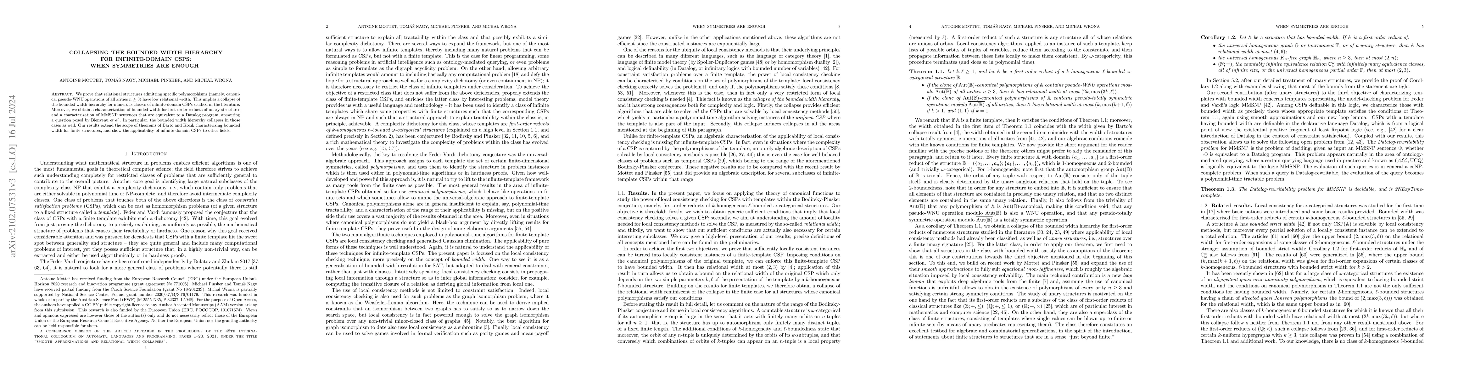 This paper demonstrates that specific polymorphisms in relational structures lead to low relational width, collapsing the bounded width hierarchy for various infinite-domain CSPs. The study also characterizes bounded width for first-order reducts and MMSNP sentences equivalent to Datalog programs, extending the applicability of these concepts to broader contexts.