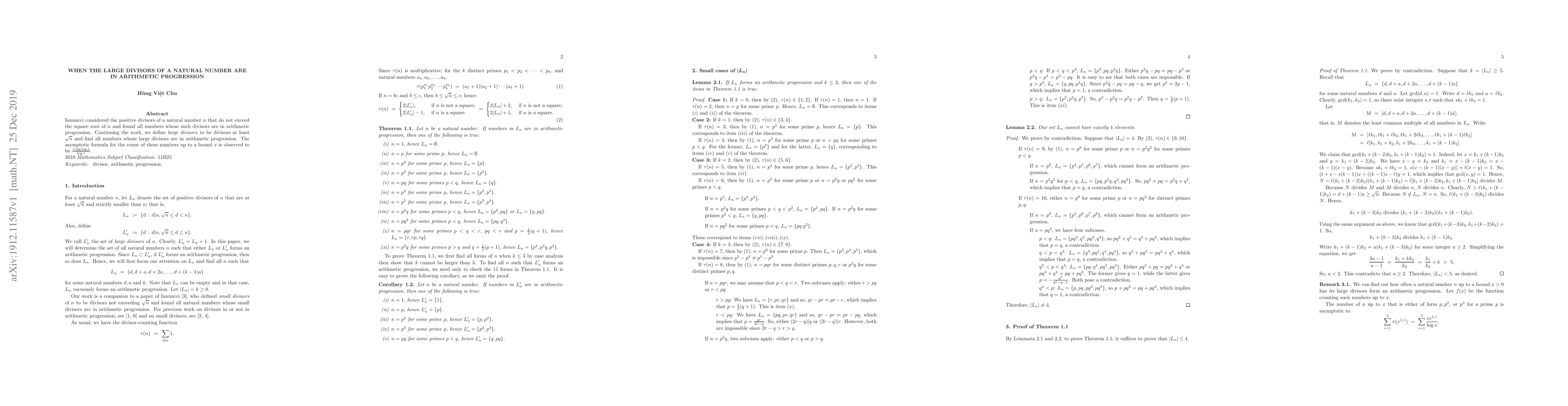 Iannucci considered the positive divisors of a natural number $n$ that do not exceed the square root of $n$ and found all numbers whose such divisors are in arithmetic progression. Continuing the work, we define large divisors to be divisors at least $\sqrt{n}$ and find all numbers whose large divisors are in arithmetic progression. The asymptotic formula for the count of these numbers up to a bound $x$ is observed to be $\frac{x\log\log x}{\log x}$.