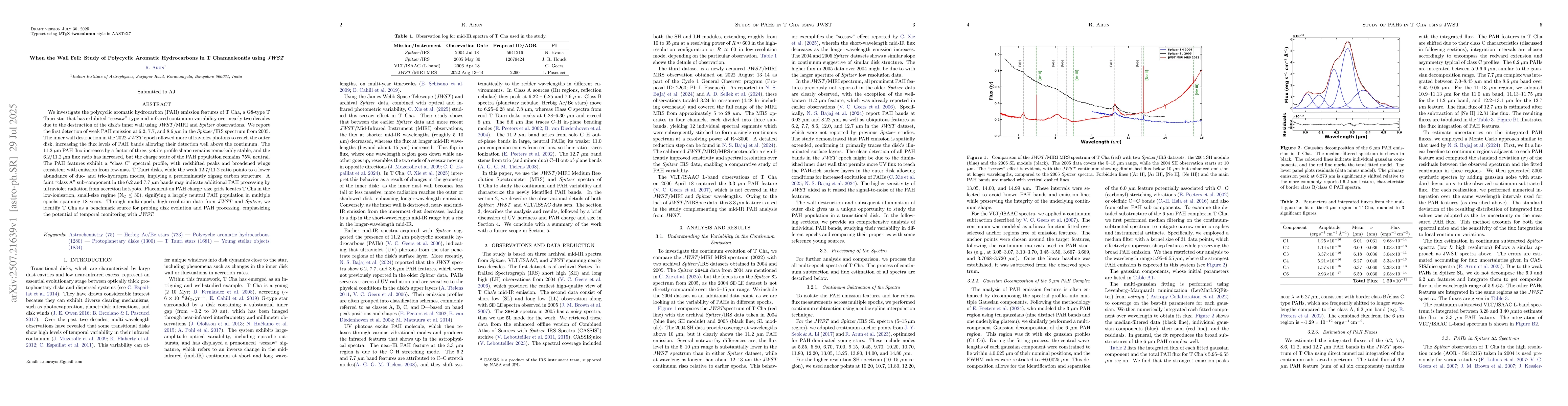 We investigate the polycyclic aromatic hydrocarbon (PAH) emission features of T Cha, a G8-type T Tauri star that has exhibited "seesaw"-type mid-infrared continuum variability over nearly two decades due to the destruction of the disk's inner wall, using JWST/MIRI and Spitzer observations. We report the first detection of weak PAH emission at 6.2, 7.7, and 8.6 microns in the Spitzer/IRS spectrum from 2005. The inner wall destruction in the 2022 JWST epoch allowed more ultraviolet photons to reach the outer disk, increasing the flux levels of PAH bands and enabling their detection well above the continuum. The 11.2 micron PAH flux increases by a factor of three, yet its profile shape remains remarkably stable. The 6.2/11.2 micron flux ratio has increased, but the charge state of the PAH population remains 75% neutral. The PAH features exhibit a "class C" spectral profile, with redshifted peaks and broadened wings consistent with emission from low-mass T Tauri disks. A weak 12.7/11.2 micron ratio points to a lower abundance of duo- and trio-hydrogen modes, implying a predominantly zigzag carbon structure. A faint "class A" sub-component in the 6.2 and 7.7 micron bands may indicate additional PAH processing by ultraviolet radiation from accretion hotspots. Placement on PAH charge-size grids locates T Cha in the low-ionisation, small-size regime (NC <= 30), signifying a largely neutral PAH population across multiple epochs spanning 18 years. Through multi-epoch, high-resolution data from JWST and Spitzer, we identify T Cha as a benchmark source for probing disk evolution and PAH processing, emphasizing the potential of temporal monitoring with JWST.