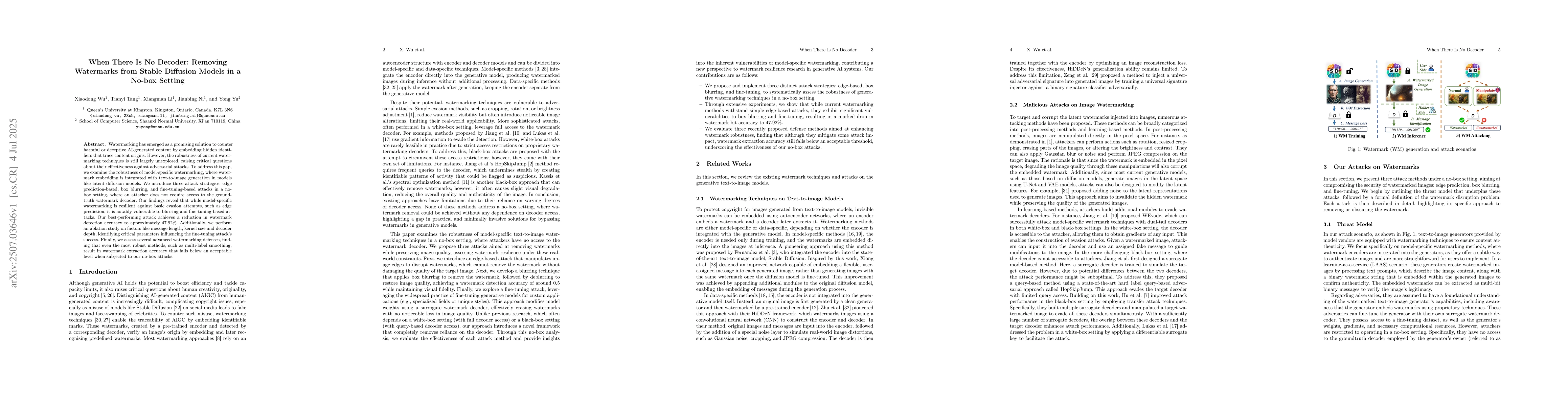This research explores the vulnerability of model-specific watermarking techniques in diffusion models to adversarial attacks, even without access to the decoder (no-box setting). The study introduces three attack strategies - edge prediction, box blurring, and fine-tuning - revealing that while basic evasion attempts fail, these attacks can significantly reduce watermark detection accuracy to around 47.92%. An ablation study identifies key parameters influencing attack success, and advanced defenses are found to be insufficient against these no-box attacks.