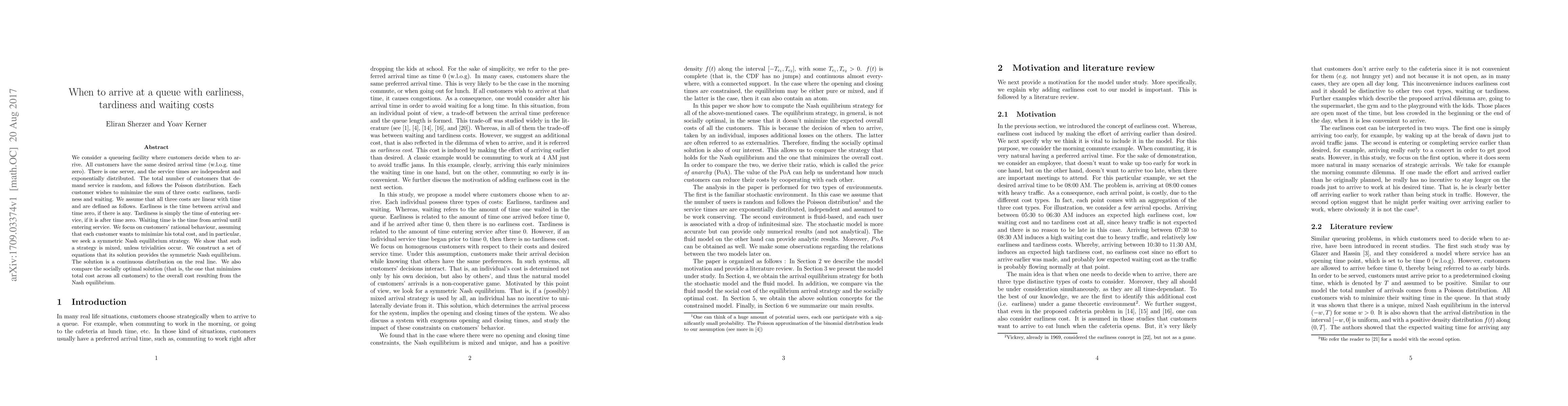 We consider a queueing facility where customers decide when to arrive. All customers have the same desired arrival time (w.l.o.g.\ time zero). There is one server, and the service times are independent and exponentially distributed. The total number of customers that demand service is random, and follows the Poisson distribution. Each customer wishes to minimize the sum of three costs: earliness, tardiness and waiting. We assume that all three costs are linear with time and are defined as follows. Earliness is the time between arrival and time zero, if there is any. Tardiness is simply the time of entering service, if it is after time zero. Waiting time is the time from arrival until entering service. We focus on customers' rational behaviour, assuming that each customer wants to minimize his total cost, and in particular, we seek a symmetric Nash equilibrium strategy. We show that such a strategy is mixed, unless trivialities occur. We construct a set of equations that its solution provides the symmetric Nash equilibrium. The solution is a continuous distribution on the real line. We also compare the socially optimal solution (that is, the one that minimizes total cost across all customers) to the overall cost resulting from the Nash equilibrium.