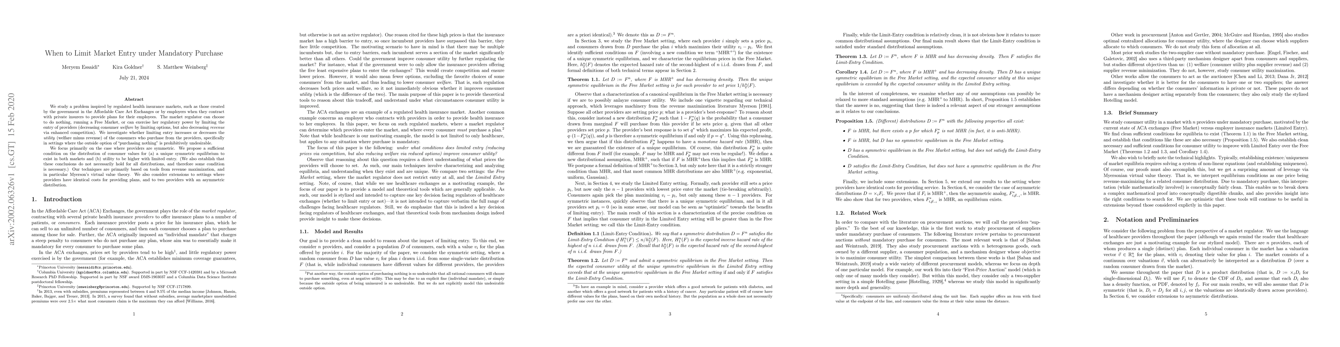 We study a problem inspired by regulated health insurance markets, such as those created by the government in the Affordable Care Act Exchanges or by employers when they contract with private insurers to provide plans for their employees. The market regulator can choose to do nothing, running a Free Market, or can exercise her regulatory power by limiting the entry of providers (decreasing consumer welfare by limiting options, but also decreasing revenue via enhanced competition). We investigate whether limiting entry increases or decreases the utility (welfare minus revenue) of the consumers who purchase from the providers, specifically in settings where the outside option of "purchasing nothing" is prohibitively undesirable. We focus primarily on the case where providers are symmetric. We propose a sufficient condition on the distribution of consumer values for (a) a unique symmetric equilibrium to exist in both markets and (b) utility to be higher with limited entry. (We also establish that these conclusions do not necessarily hold for all distributions, and therefore some condition is necessary.) Our techniques are primarily based on tools from revenue maximization, and in particular Myerson's virtual value theory. We also consider extensions to settings where providers have identical costs for providing plans, and to two providers with an asymmetric distribution.