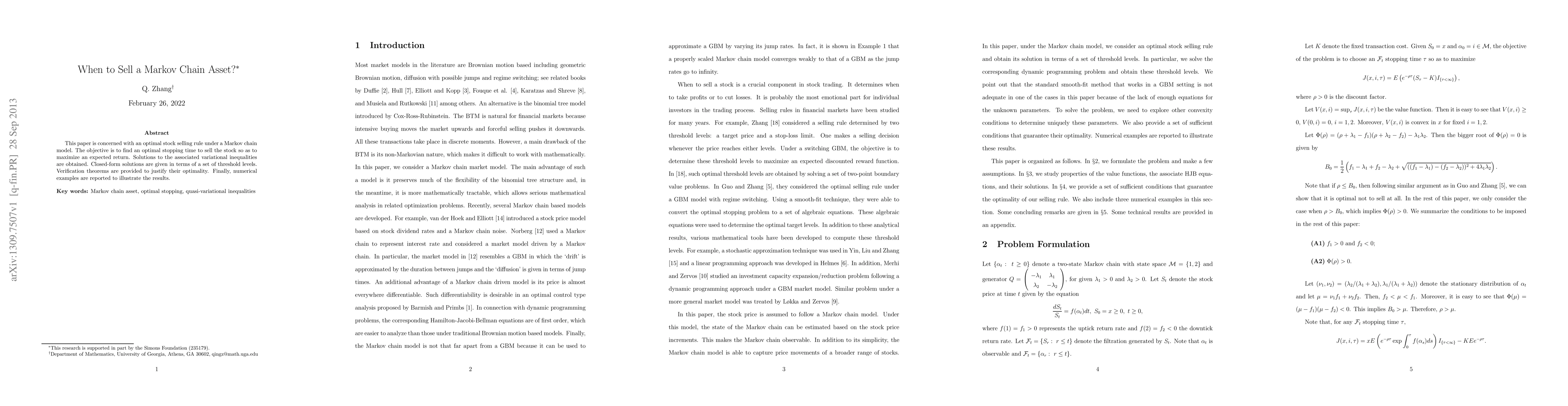 This paper is concerned with an optimal stock selling rule under a Markov chain model. The objective is to find an optimal stopping time to sell the stock so as to maximize an expected return. Solutions to the associated variational inequalities are obtained. Closed-form solutions are given in terms of a set of threshold levels. Verification theorems are provided to justify their optimality. Finally, numerical examples are reported to illustrate the results.