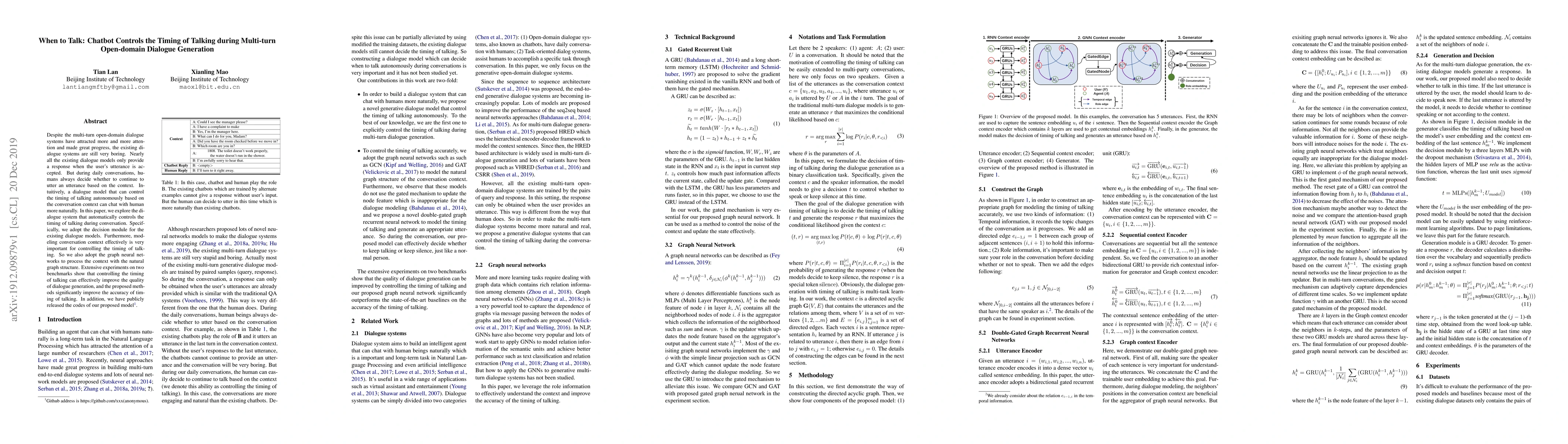 Despite the multi-turn open-domain dialogue systems have attracted more and more attention and made great progress, the existing dialogue systems are still very boring. Nearly all the existing dialogue models only provide a response when the user's utterance is accepted. But during daily conversations, humans always decide whether to continue to utter an utterance based on the context. Intuitively, a dialogue model that can control the timing of talking autonomously based on the conversation context can chat with humans more naturally. In this paper, we explore the dialogue system that automatically controls the timing of talking during the conversation. Specifically, we adopt the decision module for the existing dialogue models. Furthermore, modeling conversation context effectively is very important for controlling the timing of talking. So we also adopt the graph neural networks to process the context with the natural graph structure. Extensive experiments on two benchmarks show that controlling the timing of talking can effectively improve the quality of dialogue generation, and the proposed methods significantly improve the accuracy of the timing of talking. In addition, we have publicly released the codes of our proposed model.