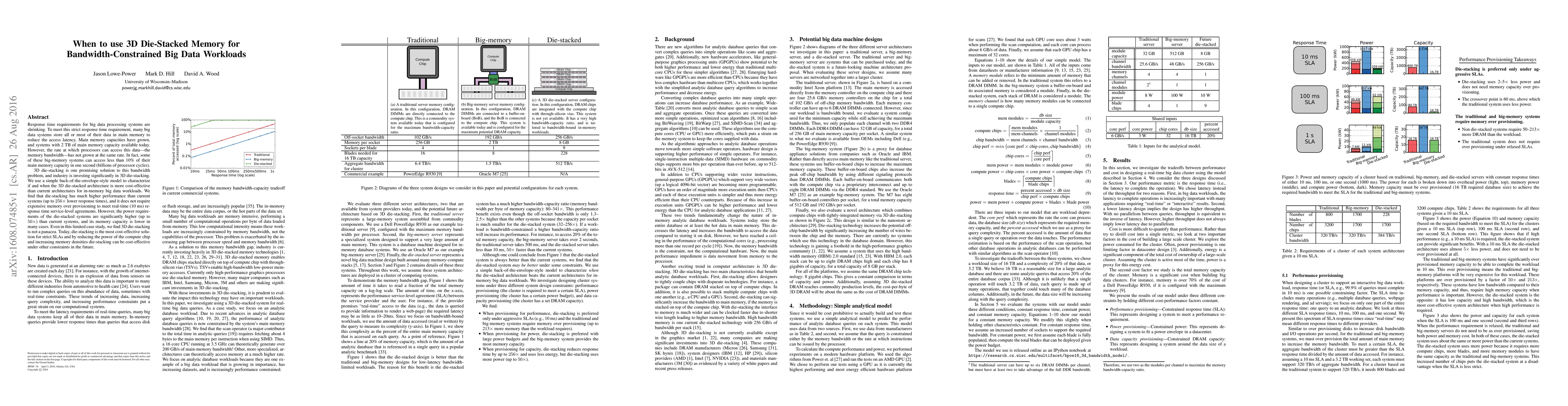 This paper evaluates the cost-effectiveness of 3D die-stacked memory for bandwidth-constrained big data workloads, finding it significantly improves performance (up to 256x lower response times) but also increases power consumption (up to 50x) and reduces memory capacity. It concludes that while 3D die-stacking is currently most effective for meeting strict SLAs, future improvements in compute power and memory density could broaden its applicability.