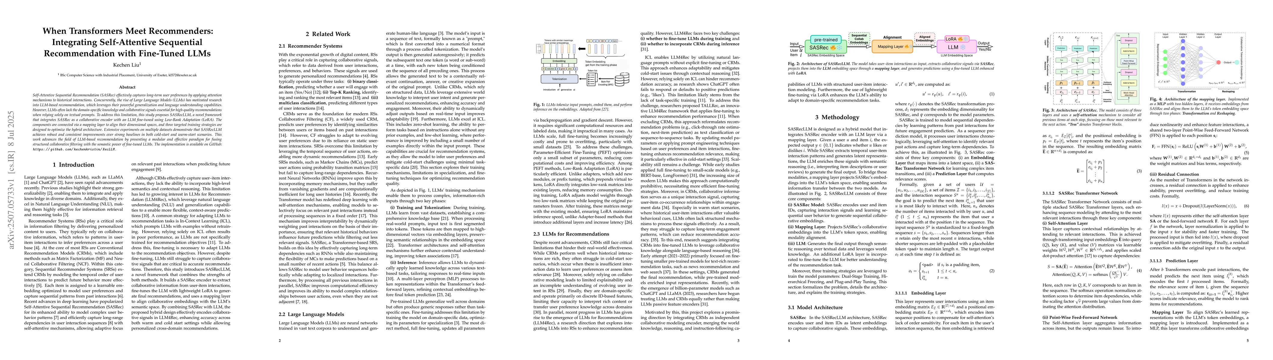 Self-Attentive Sequential Recommendation (SASRec) effectively captures long-term user preferences by applying attention mechanisms to historical interactions. Concurrently, the rise of Large Language Models (LLMs) has motivated research into LLM-based recommendation, which leverages their powerful generalization and language understanding capabilities. However, LLMs often lack the domain-specific knowledge and collaborative signals essential for high-quality recommendations when relying solely on textual prompts. To address this limitation, this study proposes SASRecLLM, a novel framework that integrates SASRec as a collaborative encoder with an LLM fine-tuned using Low-Rank Adaptation (LoRA). The components are connected via a mapping layer to align their dimensional spaces, and three targeted training strategies are designed to optimize the hybrid architecture. Extensive experiments on multiple datasets demonstrate that SASRecLLM achieves robust and consistent improvements over strong baselines in both cold-start and warm-start scenarios. This work advances the field of LLM-based recommendation by presenting a modular and effective paradigm for fusing structured collaborative filtering with the semantic power of fine-tuned LLMs. The implementation is available on GitHub: https://github.com/kechenkristin/RecLLM