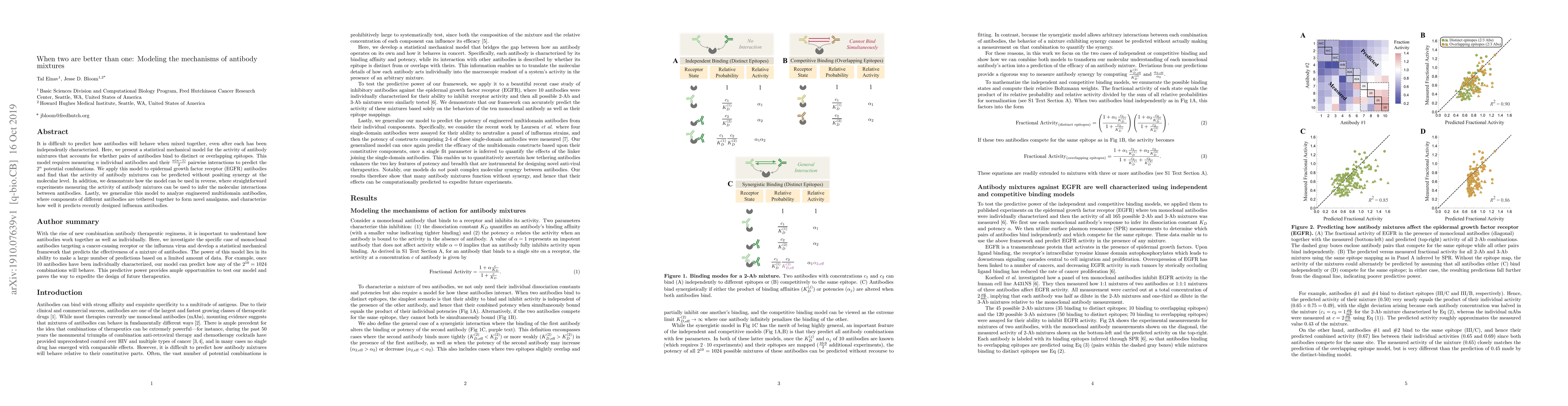 It is difficult to predict how antibodies will behave when mixed together, even after each has been independently characterized. Here, we present a statistical mechanical model for the activity of antibody mixtures that accounts for whether pairs of antibodies bind to distinct or overlapping epitopes. This model requires measuring $n$ individual antibodies and their $n(n-1)/2$ pairwise interactions to predict the $2^n$ potential combinations. We apply this model to epidermal growth factor receptor (EGFR) antibodies and find that the activity of antibody mixtures can be predicted without positing synergy at the molecular level. In addition, we demonstrate how the model can be used in reverse, where straightforward experiments measuring the activity of antibody mixtures can be used to infer the molecular interactions between antibodies. Lastly, we generalize this model to analyze engineered multidomain antibodies, where components of different antibodies are tethered together to form novel amalgams, and characterize how well it predicts recently designed influenza antibodies.