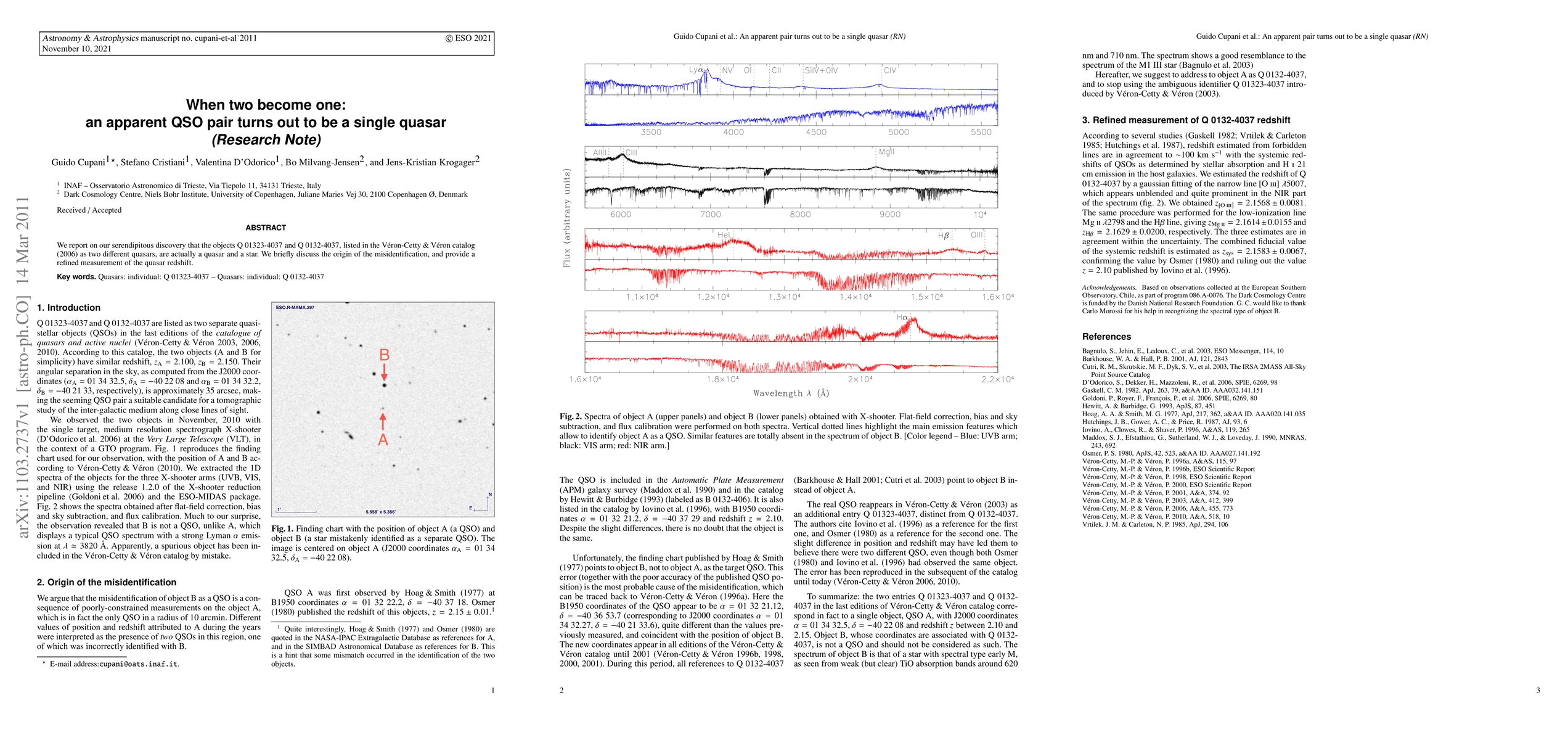We report on our serendipitous discovery that the objects Q 01323-4037 and Q 0132-4037, listed in the V\'eron-Cetty & V\'eron catalog (2006) as two different quasars, are actually a quasar and a star. We briefly discuss the origin of the misidentification, and provide a refined measurement of the quasar redshift.