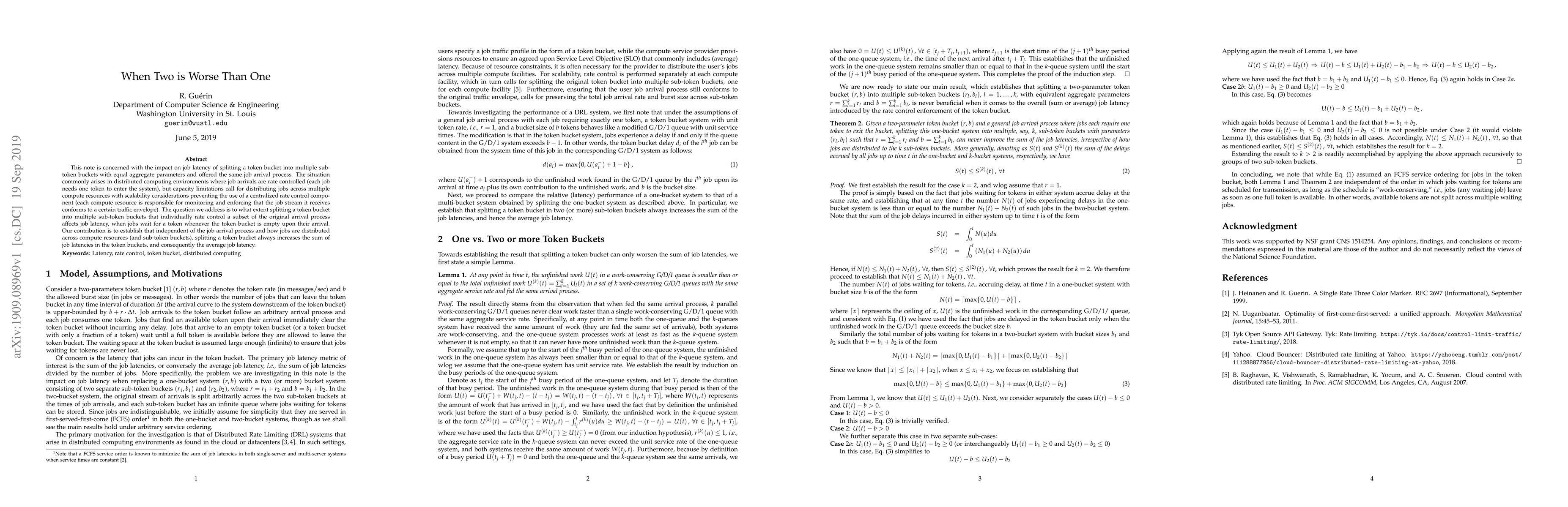Splitting a token bucket into multiple sub-token buckets increases overall job latency due to additional waiting times, regardless of the job arrival process or distribution strategy.