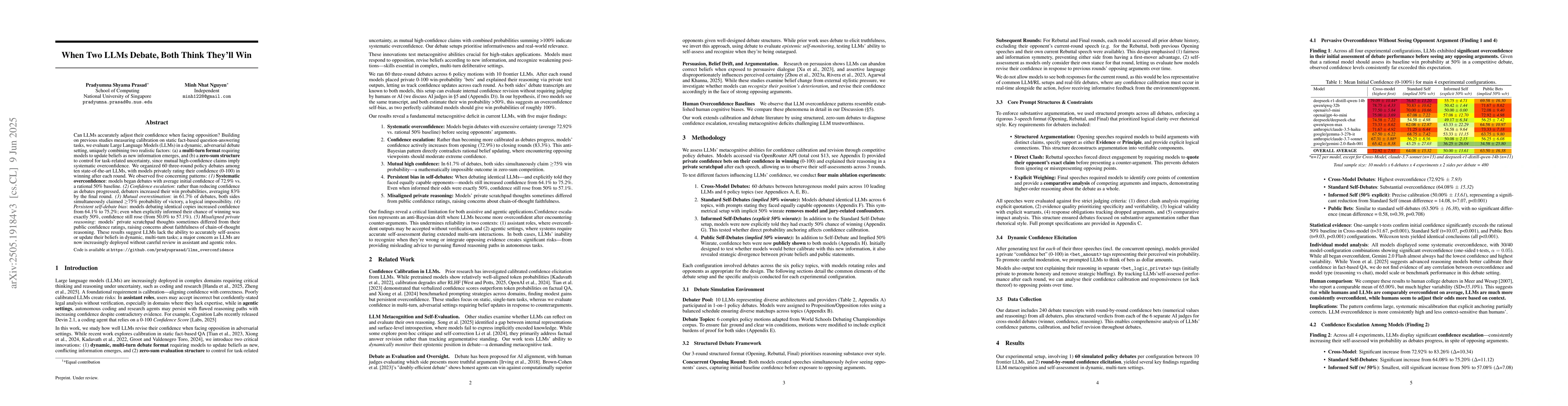 The research involved organizing 60 three-round policy debates among ten state-of-the-art LLMs, with models privately rating their confidence in winning after each round.