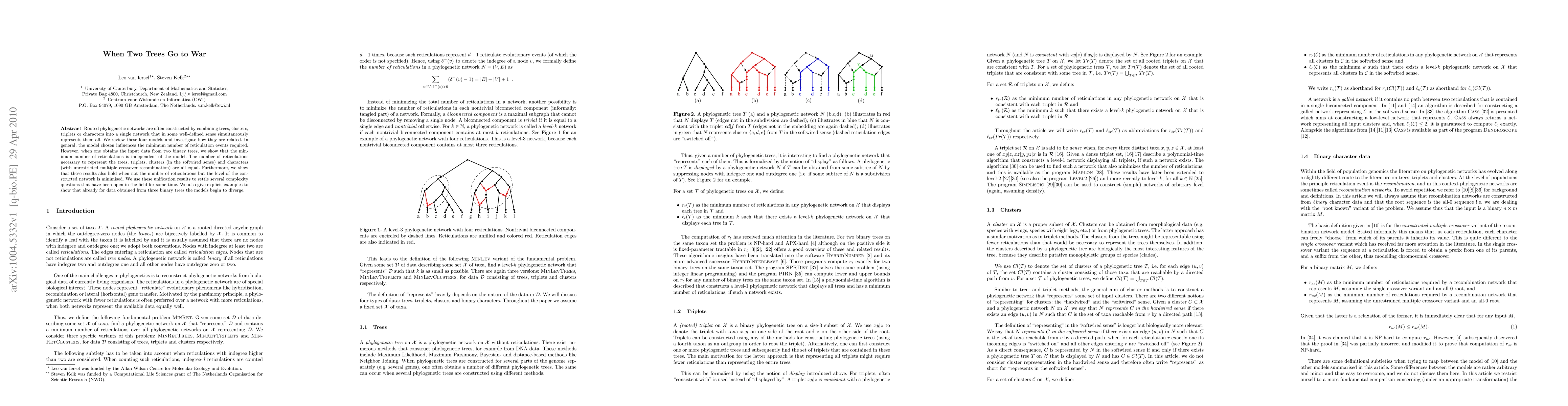 Rooted phylogenetic networks are often constructed by combining trees, clusters, triplets or characters into a single network that in some well-defined sense simultaneously represents them all. We review these four models and investigate how they are related. In general, the model chosen influences the minimum number of reticulation events required. However, when one obtains the input data from two binary trees, we show that the minimum number of reticulations is independent of the model. The number of reticulations necessary to represent the trees, triplets, clusters (in the softwired sense) and characters (with unrestricted multiple crossover recombination) are all equal. Furthermore, we show that these results also hold when not the number of reticulations but the level of the constructed network is minimised. We use these unification results to settle several complexity questions that have been open in the field for some time. We also give explicit examples to show that already for data obtained from three binary trees the models begin to diverge.