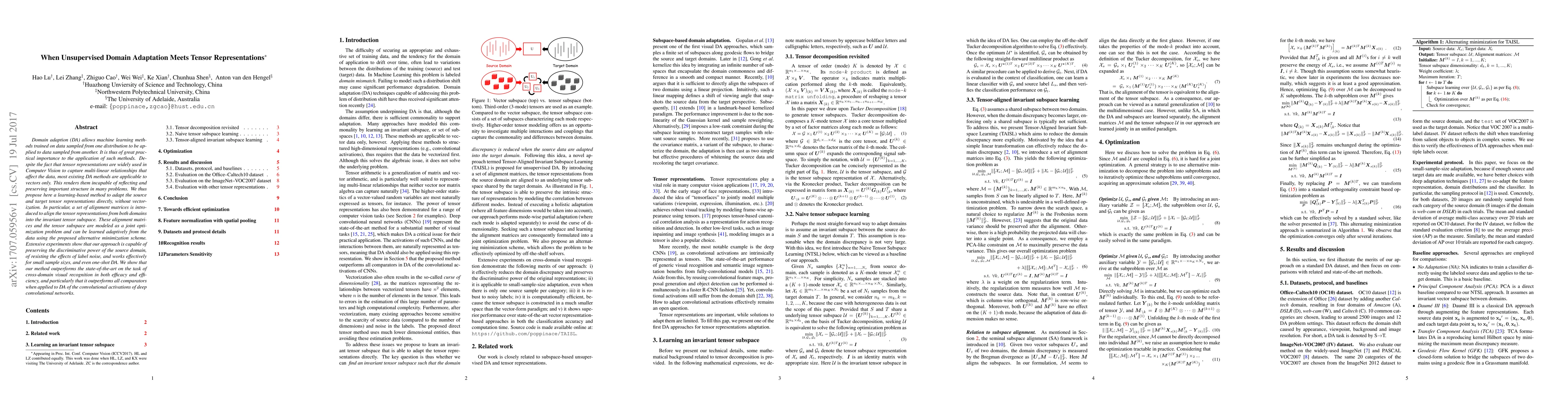 Domain adaption (DA) allows machine learning methods trained on data sampled from one distribution to be applied to data sampled from another. It is thus of great practical importance to the application of such methods. Despite the fact that tensor representations are widely used in Computer Vision to capture multi-linear relationships that affect the data, most existing DA methods are applicable to vectors only. This renders them incapable of reflecting and preserving important structure in many problems. We thus propose here a learning-based method to adapt the source and target tensor representations directly, without vectorization. In particular, a set of alignment matrices is introduced to align the tensor representations from both domains into the invariant tensor subspace. These alignment matrices and the tensor subspace are modeled as a joint optimization problem and can be learned adaptively from the data using the proposed alternative minimization scheme. Extensive experiments show that our approach is capable of preserving the discriminative power of the source domain, of resisting the effects of label noise, and works effectively for small sample sizes, and even one-shot DA. We show that our method outperforms the state-of-the-art on the task of cross-domain visual recognition in both efficacy and efficiency, and particularly that it outperforms all comparators when applied to DA of the convolutional activations of deep convolutional networks.