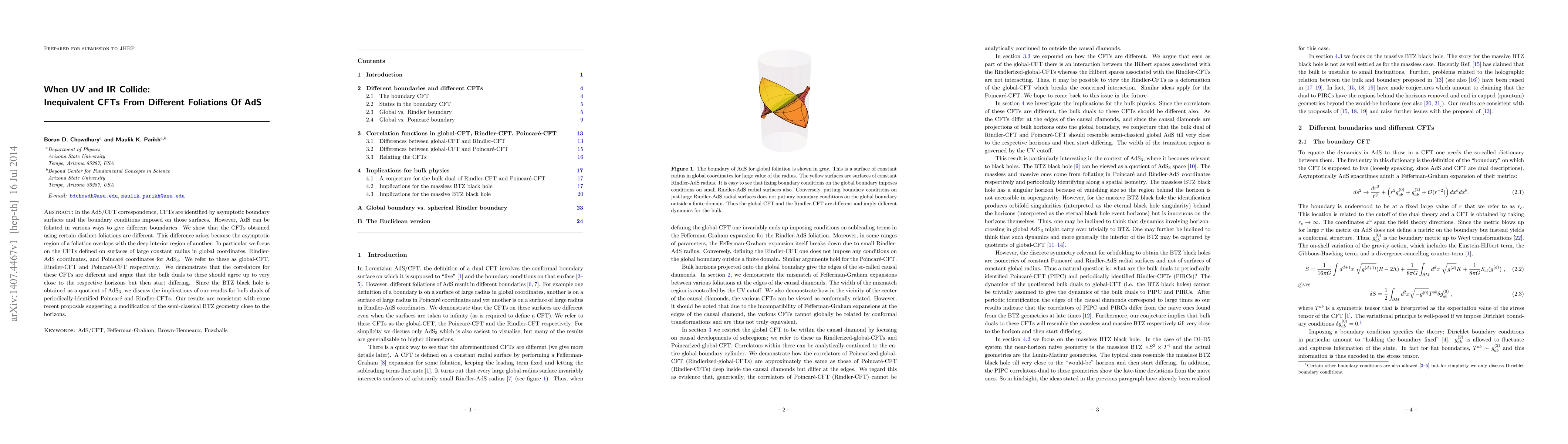 In the AdS/CFT correspondence, CFTs are identified by asymptotic boundary surfaces and the boundary conditions imposed on those surfaces. However, AdS can be foliated in various ways to give different boundaries. We show that the CFTs obtained using certain distinct foliations are different. This difference arises because the asymptotic region of a foliation overlaps with the deep interior region of another. In particular we focus on the CFTs defined on surfaces of large constant radius in global coordinates, Rindler-AdS coordinates, and Poincar\'e coordinates for AdS$_3$. We refer to these as global-CFT, Rindler-CFT and Poincar\'e-CFT respectively. We demonstrate that the correlators for these CFTs are different and argue that the bulk duals to these should agree up to very close to the respective horizons but then start differing. Since the BTZ black hole is obtained as a quotient of AdS$_3$, we discuss the implications of our results for bulk duals of periodically-identified Poincar\'e and Rindler-CFTs. Our results are consistent with some recent proposals suggesting a modification of the semi-classical BTZ geometry close to the horizons.