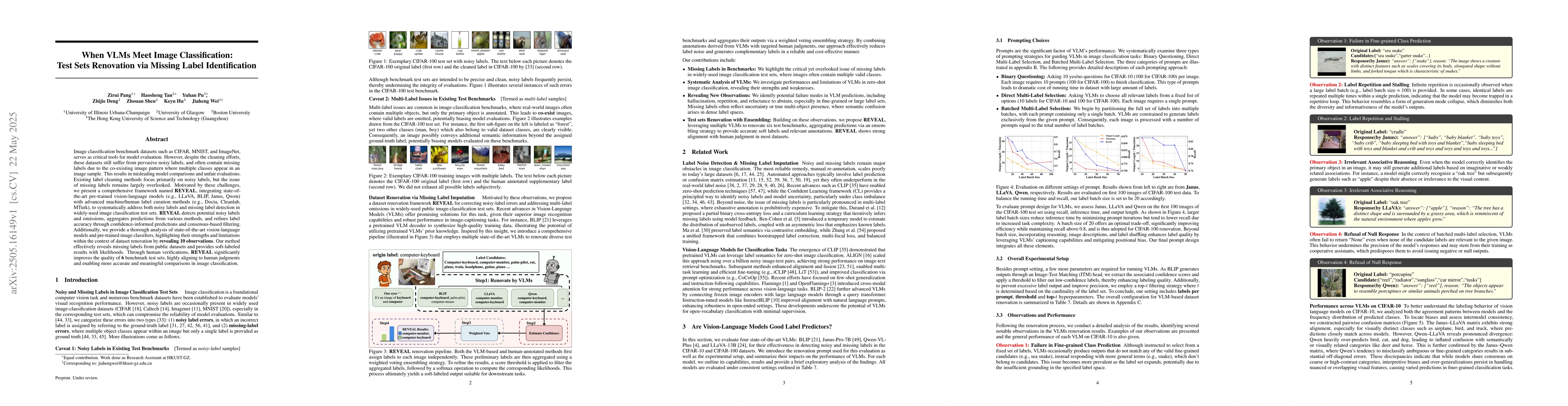 Image classification benchmark datasets such as CIFAR, MNIST, and ImageNet serve as critical tools for model evaluation. However, despite the cleaning efforts, these datasets still suffer from pervasive noisy labels and often contain missing labels due to the co-existing image pattern where multiple classes appear in an image sample. This results in misleading model comparisons and unfair evaluations. Existing label cleaning methods focus primarily on noisy labels, but the issue of missing labels remains largely overlooked. Motivated by these challenges, we present a comprehensive framework named REVEAL, integrating state-of-the-art pre-trained vision-language models (e.g., LLaVA, BLIP, Janus, Qwen) with advanced machine/human label curation methods (e.g., Docta, Cleanlab, MTurk), to systematically address both noisy labels and missing label detection in widely-used image classification test sets. REVEAL detects potential noisy labels and omissions, aggregates predictions from various methods, and refines label accuracy through confidence-informed predictions and consensus-based filtering. Additionally, we provide a thorough analysis of state-of-the-art vision-language models and pre-trained image classifiers, highlighting their strengths and limitations within the context of dataset renovation by revealing 10 observations. Our method effectively reveals missing labels from public datasets and provides soft-labeled results with likelihoods. Through human verifications, REVEAL significantly improves the quality of 6 benchmark test sets, highly aligning to human judgments and enabling more accurate and meaningful comparisons in image classification.