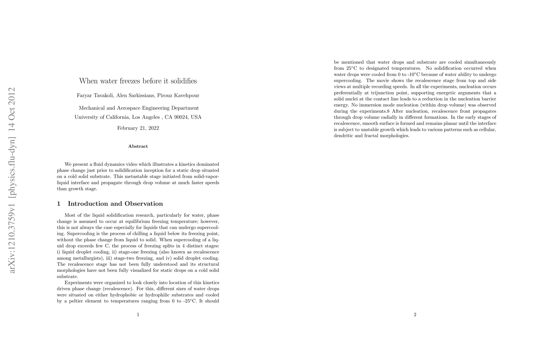 We present a fluid dynamics video which illustrates a kinetic-dominated phase change just prior to solidification inception for a static drop situated on a cold solid substrate. This metastable stage initiated from solid-vapor-liquid interface and propagates through drop volume at much faster speeds than solidification growth stage.