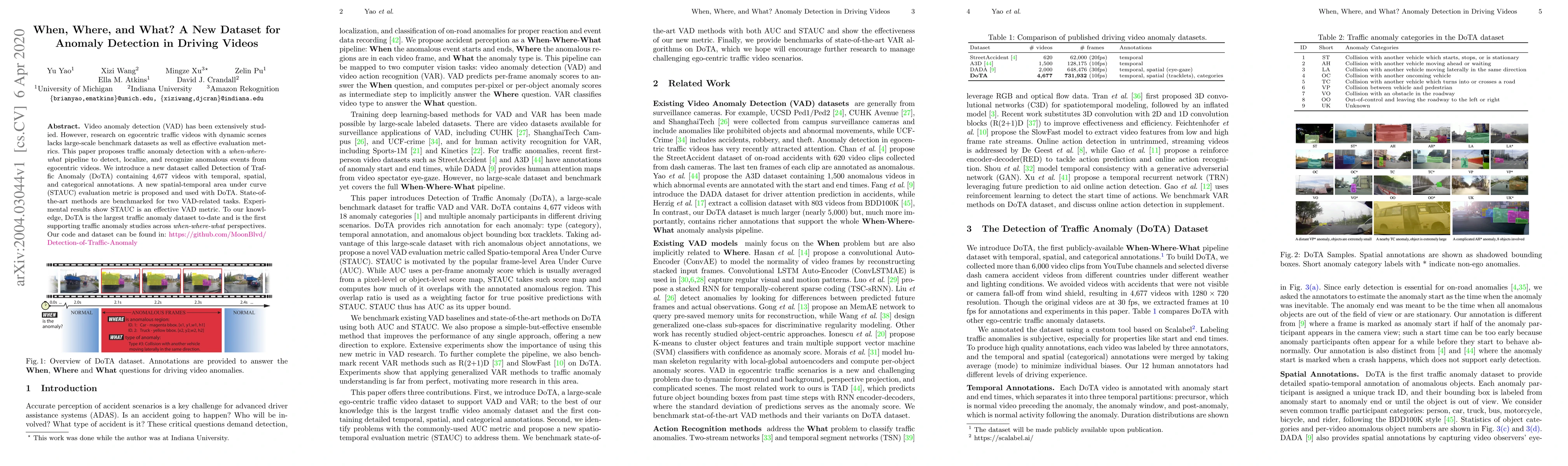 This paper introduces a new dataset, Detection of Traffic Anomaly (DoTA), for video anomaly detection in egocentric traffic videos, featuring 4,677 videos with detailed annotations. The authors propose a new evaluation metric, STAUC, and benchmark state-of-the-art methods, demonstrating its effectiveness.