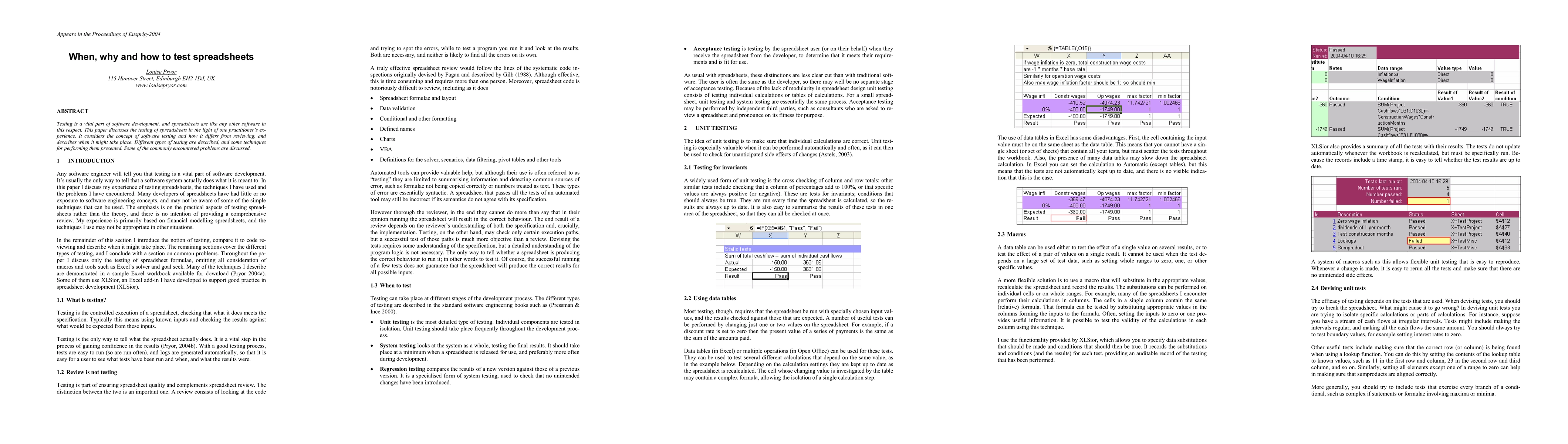 This paper discusses the importance of testing spreadsheets in software development, highlighting common problems and techniques for effective testing. It emphasizes the need for a structured approach to spreadsheet testing, including when, why, and how to test them.