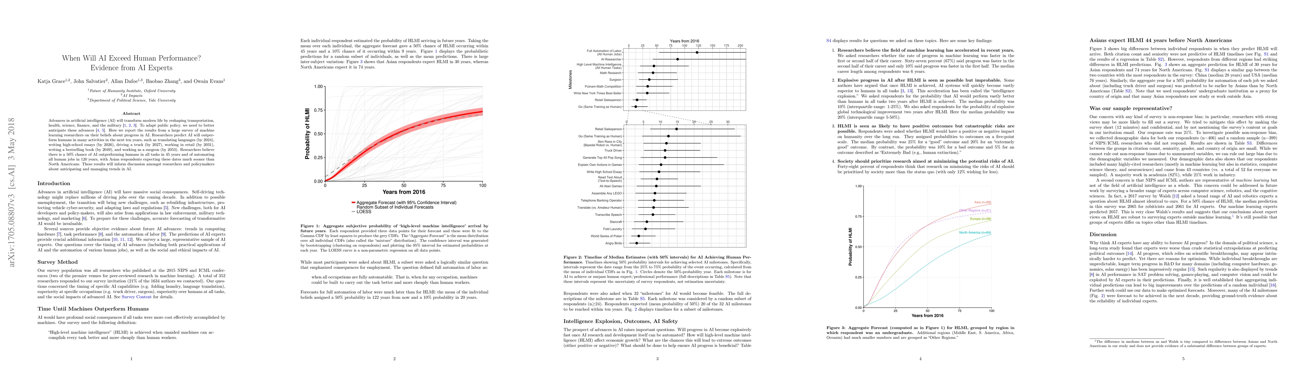Advances in artificial intelligence (AI) will transform modern life by reshaping transportation, health, science, finance, and the military. To adapt public policy, we need to better anticipate these advances. Here we report the results from a large survey of machine learning researchers on their beliefs about progress in AI. Researchers predict AI will outperform humans in many activities in the next ten years, such as translating languages (by 2024), writing high-school essays (by 2026), driving a truck (by 2027), working in retail (by 2031), writing a bestselling book (by 2049), and working as a surgeon (by 2053). Researchers believe there is a 50% chance of AI outperforming humans in all tasks in 45 years and of automating all human jobs in 120 years, with Asian respondents expecting these dates much sooner than North Americans. These results will inform discussion amongst researchers and policymakers about anticipating and managing trends in AI.