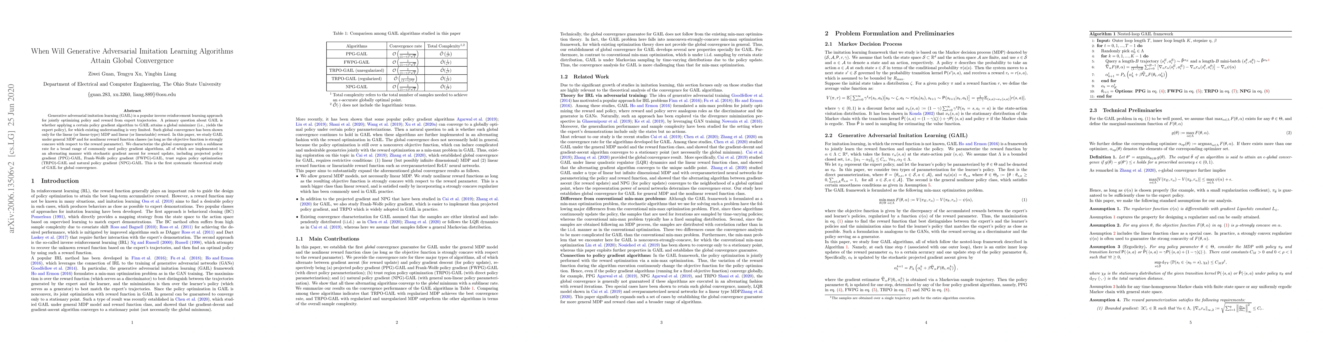 Generative adversarial imitation learning (GAIL) is a popular inverse reinforcement learning approach for jointly optimizing policy and reward from expert trajectories. A primary question about GAIL is whether applying a certain policy gradient algorithm to GAIL attains a global minimizer (i.e., yields the expert policy), for which existing understanding is very limited. Such global convergence has been shown only for the linear (or linear-type) MDP and linear (or linearizable) reward. In this paper, we study GAIL under general MDP and for nonlinear reward function classes (as long as the objective function is strongly concave with respect to the reward parameter). We characterize the global convergence with a sublinear rate for a broad range of commonly used policy gradient algorithms, all of which are implemented in an alternating manner with stochastic gradient ascent for reward update, including projected policy gradient (PPG)-GAIL, Frank-Wolfe policy gradient (FWPG)-GAIL, trust region policy optimization (TRPO)-GAIL and natural policy gradient (NPG)-GAIL. This is the first systematic theoretical study of GAIL for global convergence.