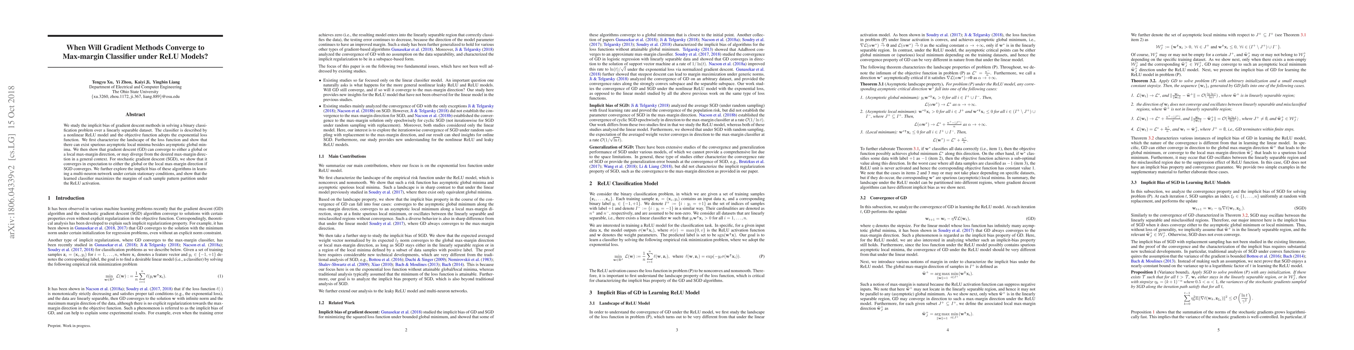 We study the implicit bias of gradient descent methods in solving a binary classification problem over a linearly separable dataset. The classifier is described by a nonlinear ReLU model and the objective function adopts the exponential loss function. We first characterize the landscape of the loss function and show that there can exist spurious asymptotic local minima besides asymptotic global minima. We then show that gradient descent (GD) can converge to either a global or a local max-margin direction, or may diverge from the desired max-margin direction in a general context. For stochastic gradient descent (SGD), we show that it converges in expectation to either the global or the local max-margin direction if SGD converges. We further explore the implicit bias of these algorithms in learning a multi-neuron network under certain stationary conditions, and show that the learned classifier maximizes the margins of each sample pattern partition under the ReLU activation.