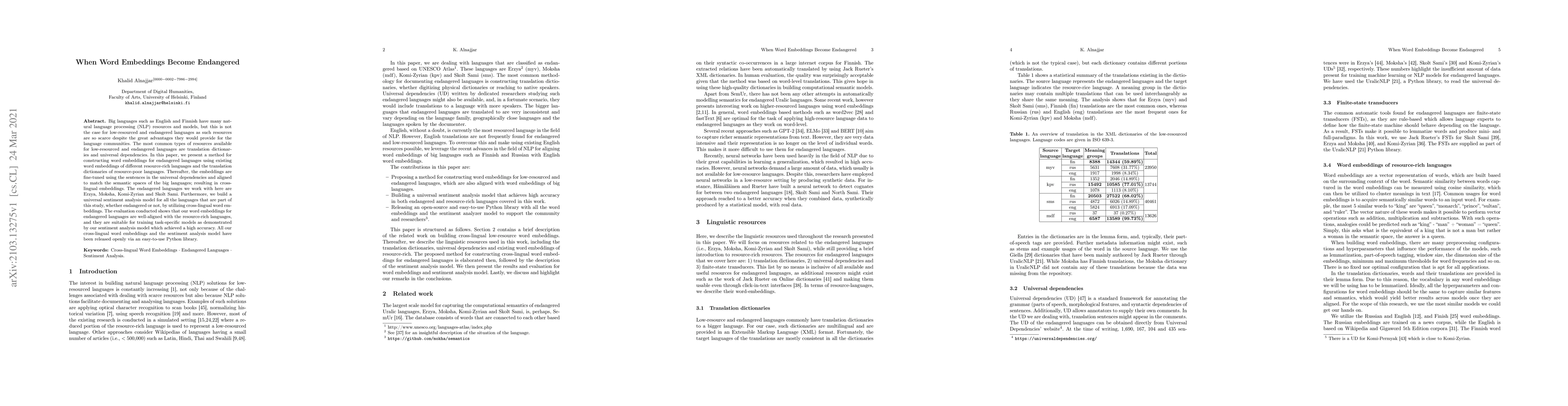 Big languages such as English and Finnish have many natural language processing (NLP) resources and models, but this is not the case for low-resourced and endangered languages as such resources are so scarce despite the great advantages they would provide for the language communities. The most common types of resources available for low-resourced and endangered languages are translation dictionaries and universal dependencies. In this paper, we present a method for constructing word embeddings for endangered languages using existing word embeddings of different resource-rich languages and the translation dictionaries of resource-poor languages. Thereafter, the embeddings are fine-tuned using the sentences in the universal dependencies and aligned to match the semantic spaces of the big languages; resulting in cross-lingual embeddings. The endangered languages we work with here are Erzya, Moksha, Komi-Zyrian and Skolt Sami. Furthermore, we build a universal sentiment analysis model for all the languages that are part of this study, whether endangered or not, by utilizing cross-lingual word embeddings. The evaluation conducted shows that our word embeddings for endangered languages are well-aligned with the resource-rich languages, and they are suitable for training task-specific models as demonstrated by our sentiment analysis model which achieved a high accuracy. All our cross-lingual word embeddings and the sentiment analysis model have been released openly via an easy-to-use Python library.